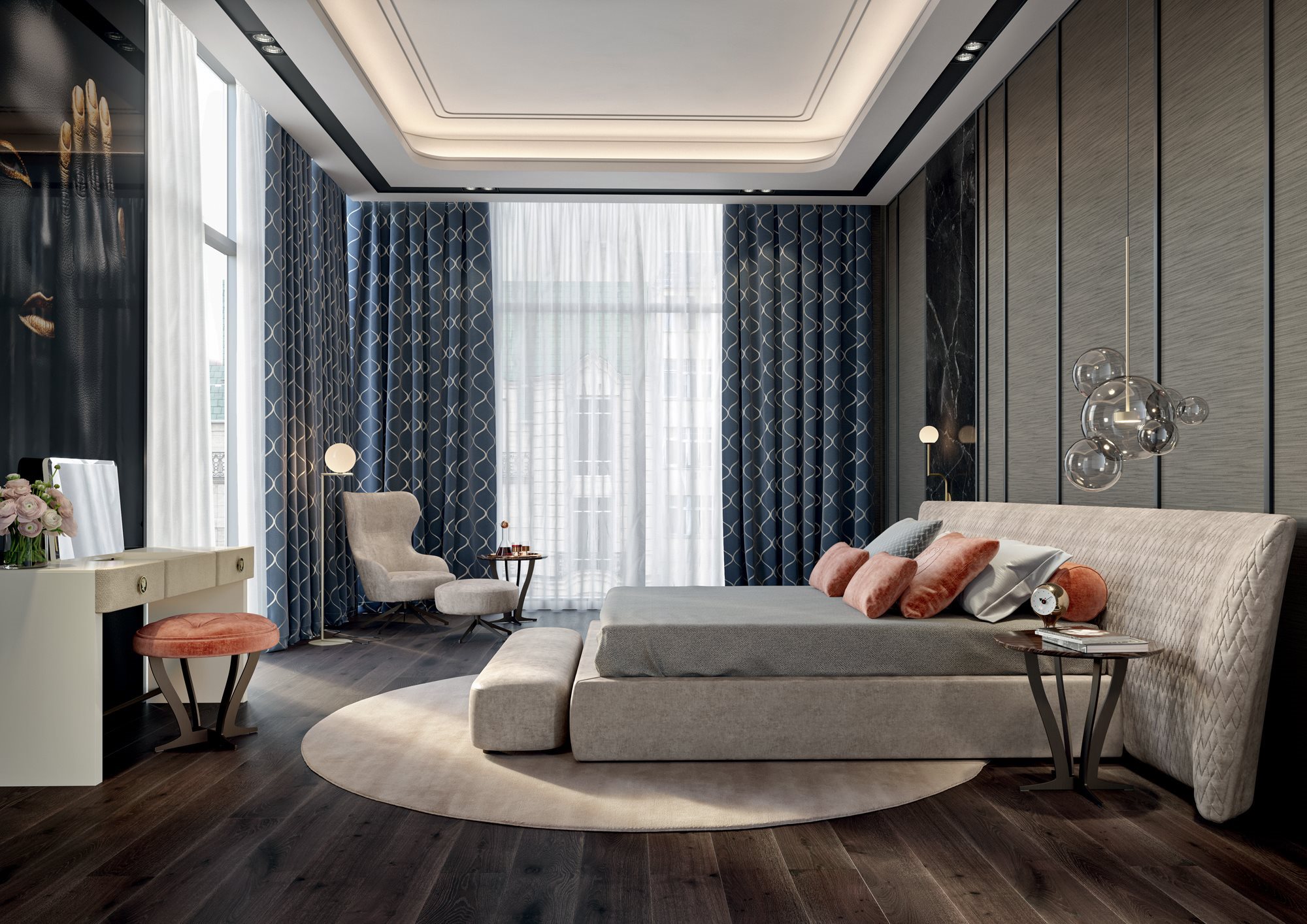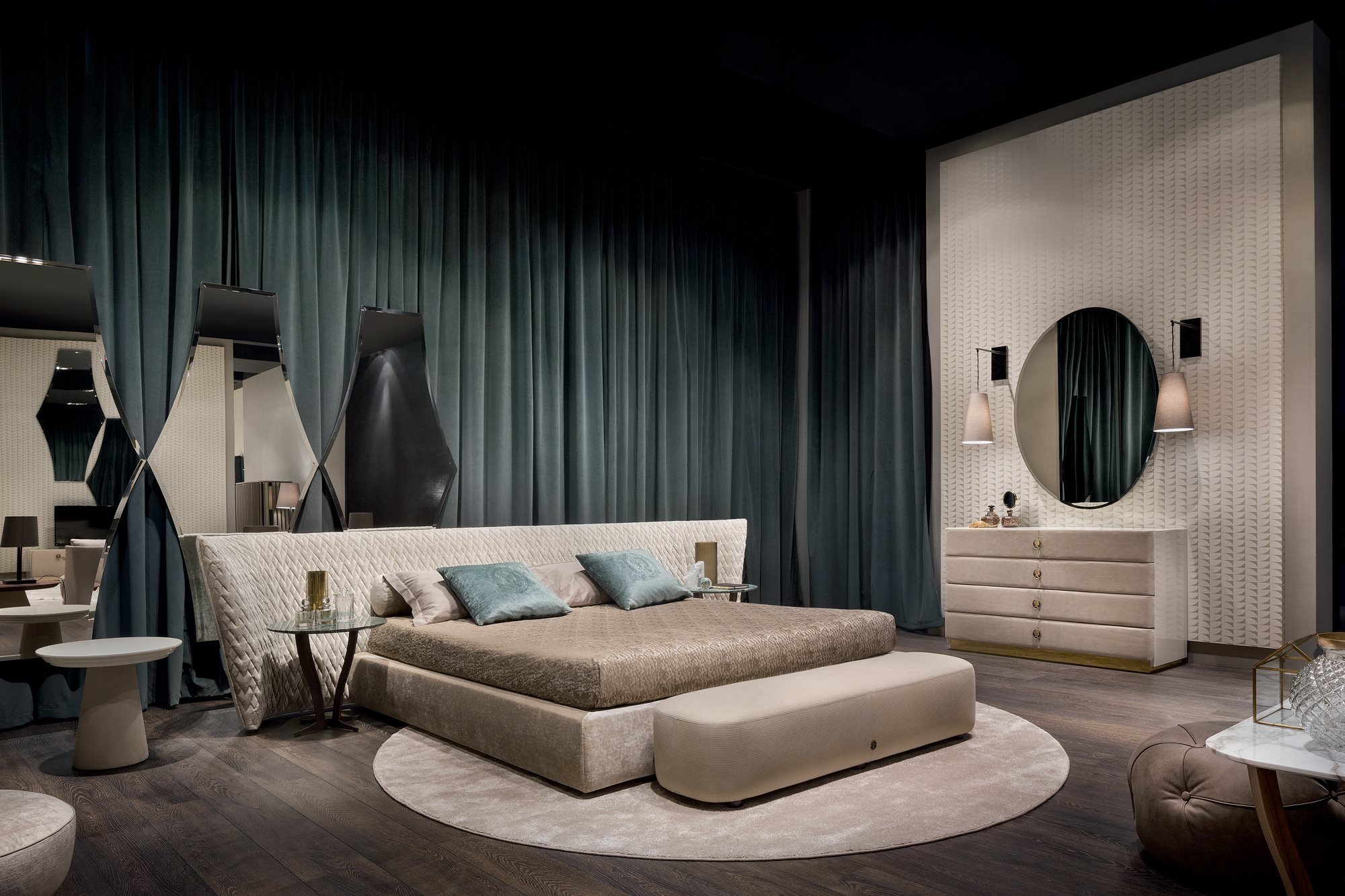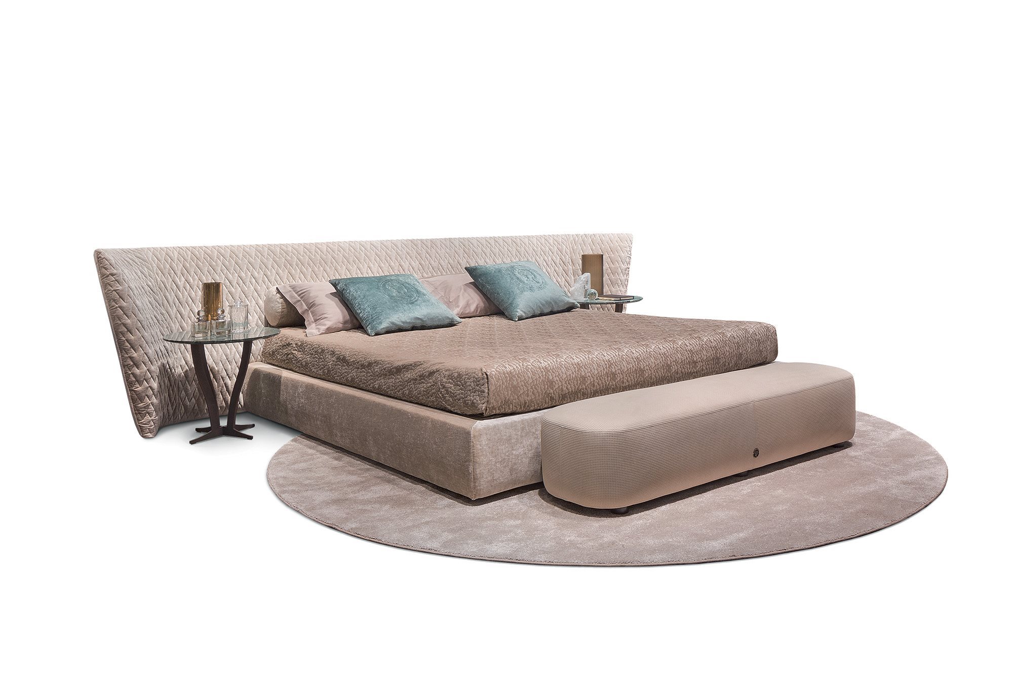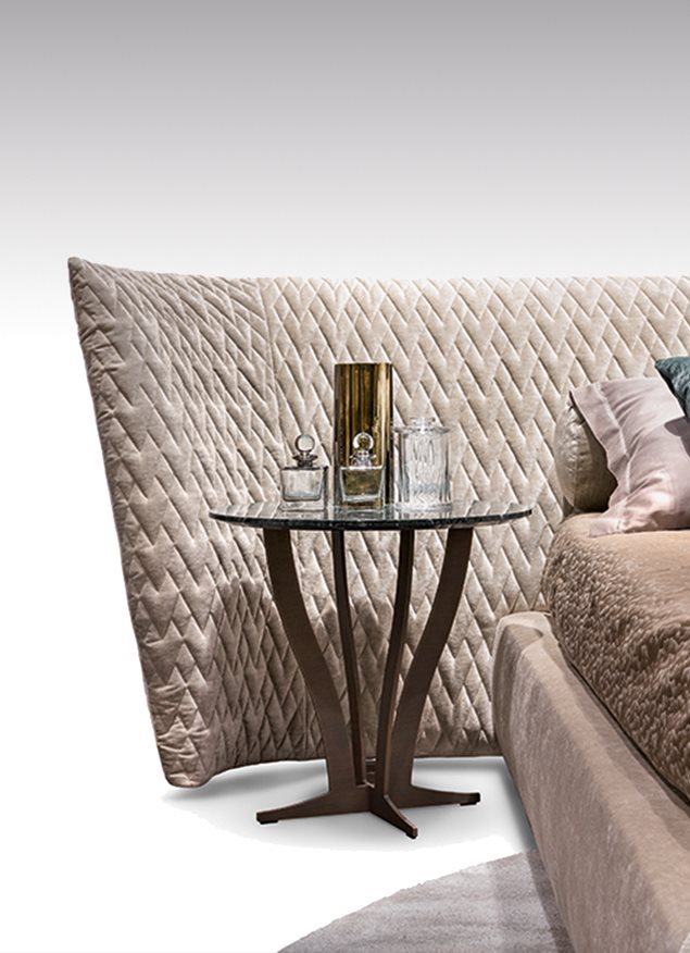 The defining feature of the Semira bed is the wide embrace of the bed head which stretches round to encompass the bedside tables, creating an intimate atmosphere and conjuring up an instant feeling of comfort. Its soft, cosy shape fits perfectly into modern and classic settings, thanks to its simple style and timeless design. The covers, featuring the best of skilled craftsmanship, can have a buttoned-back or quilted finish with an original geometrical texture.