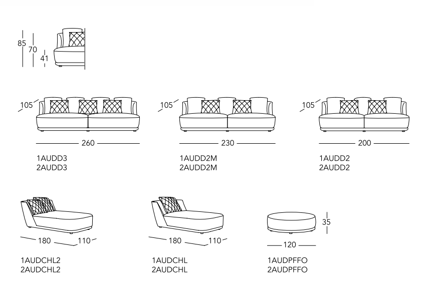 Sofas VIVIEN / GRACE / AUDREY are characterized by rounded and romantic lines. They are the result of a perfect combination between a classic and contemporary style. The high smooth back cushions VIVIEN and the special back cushions with diamond sewing of the models AUDREY and GRACE make them unique pieces, with three different souls able to satisfy the needs of the most demanding interior designers.