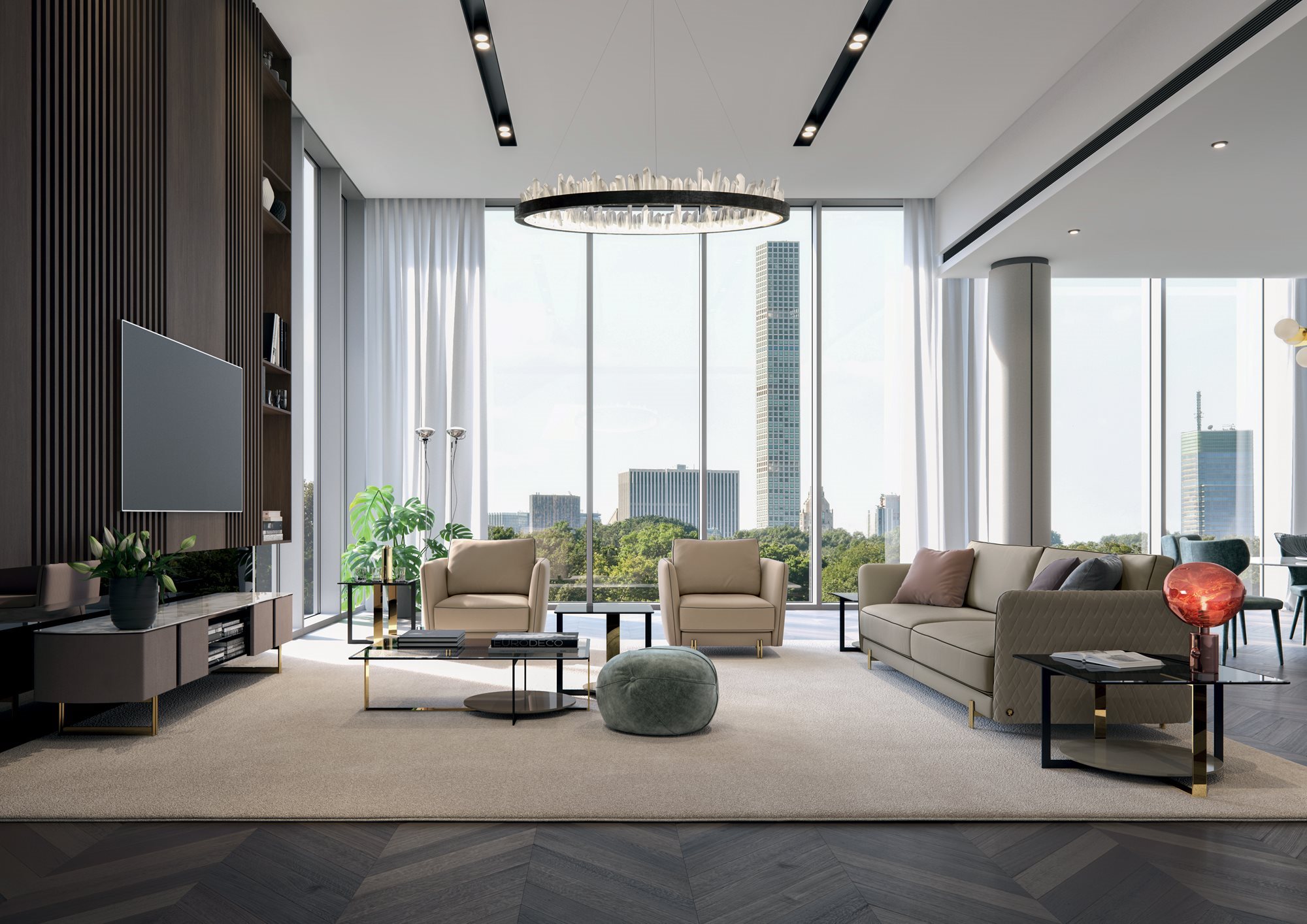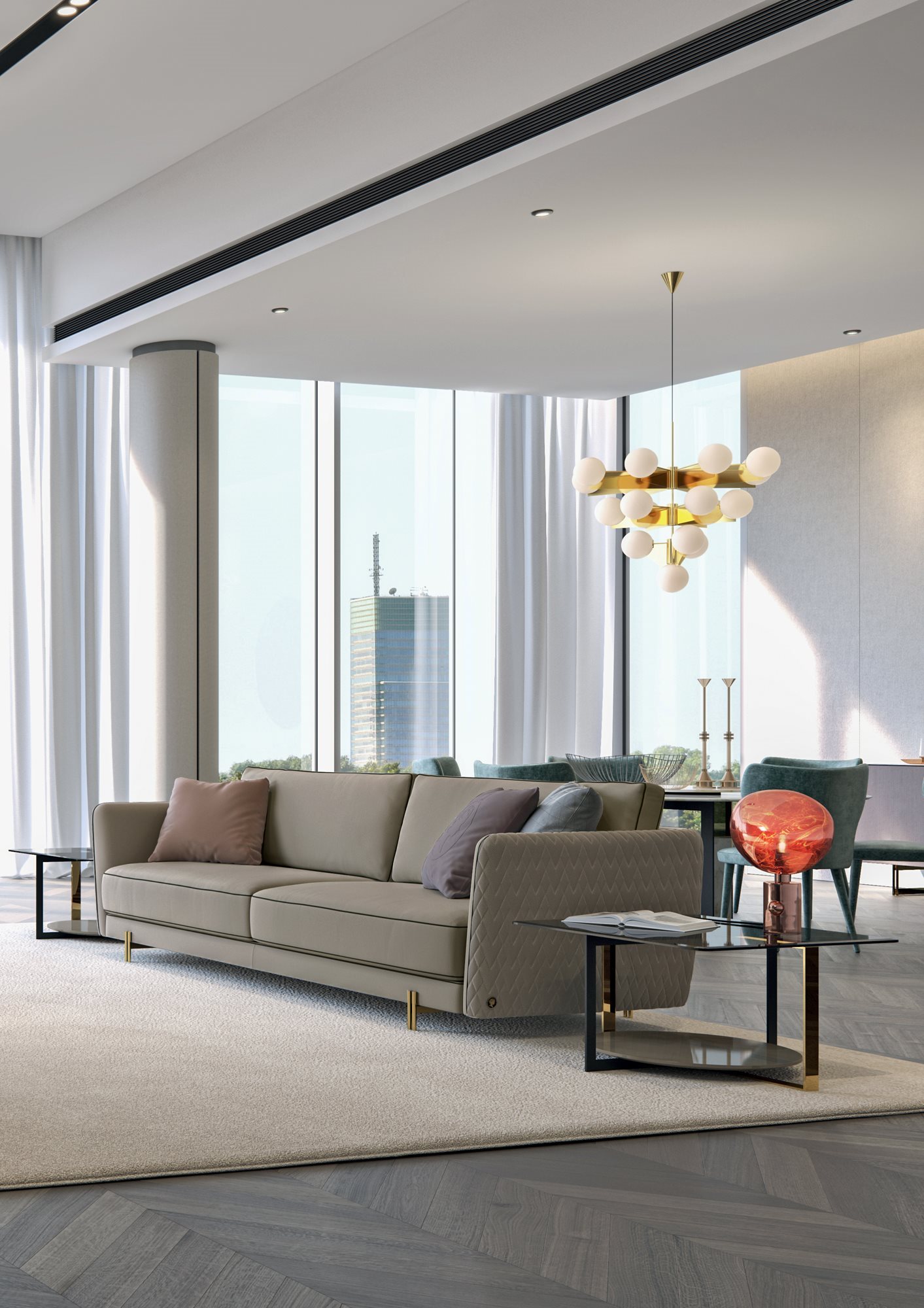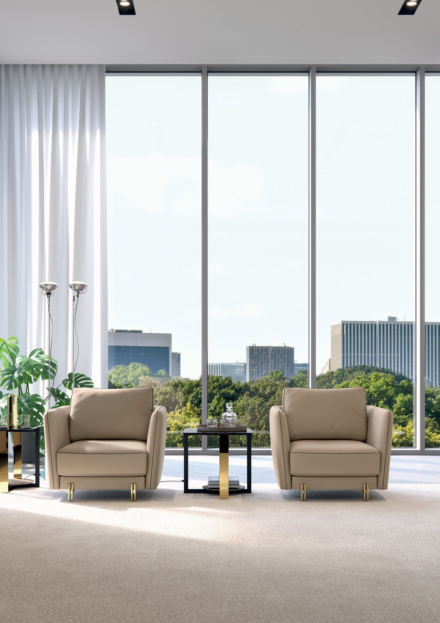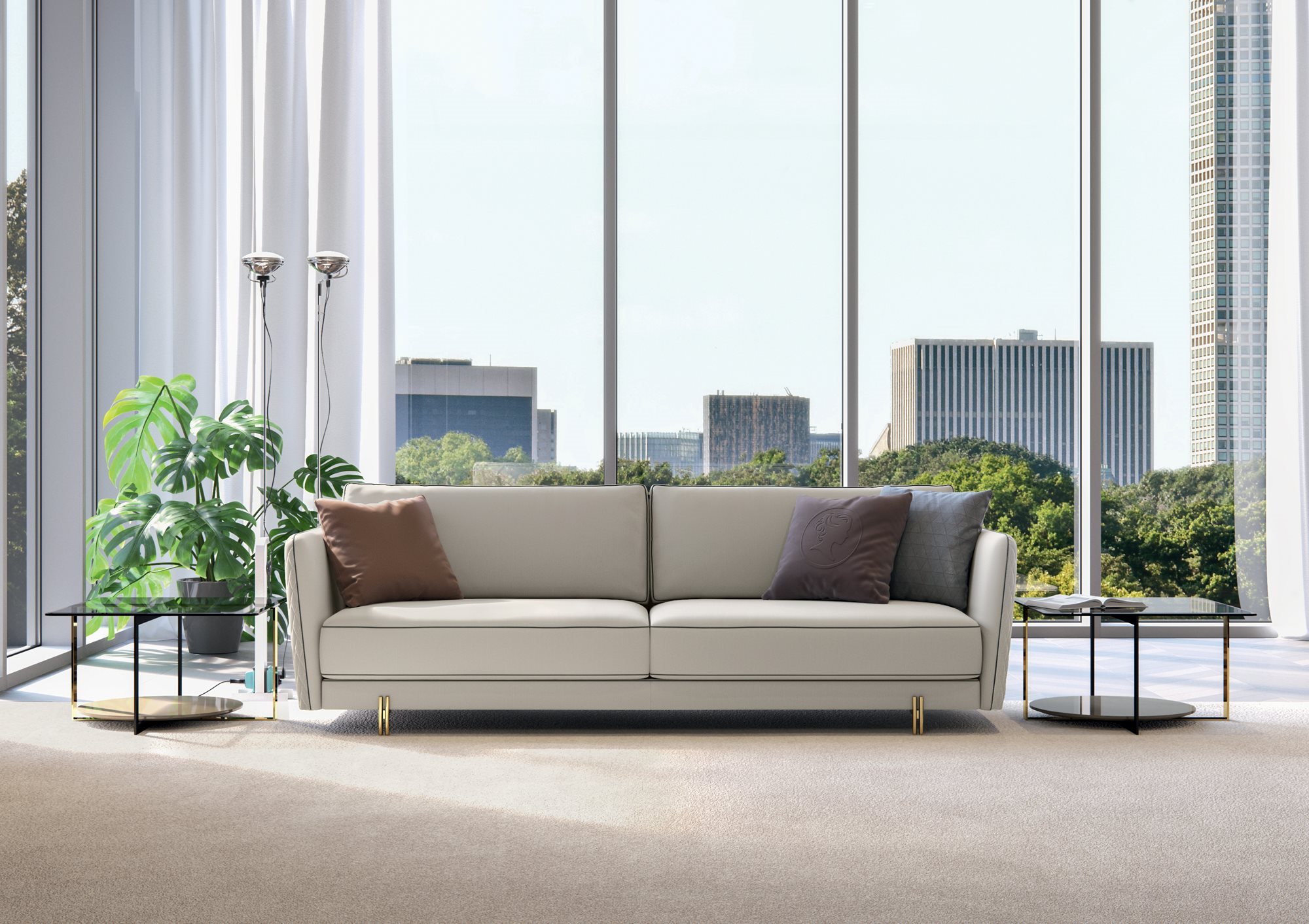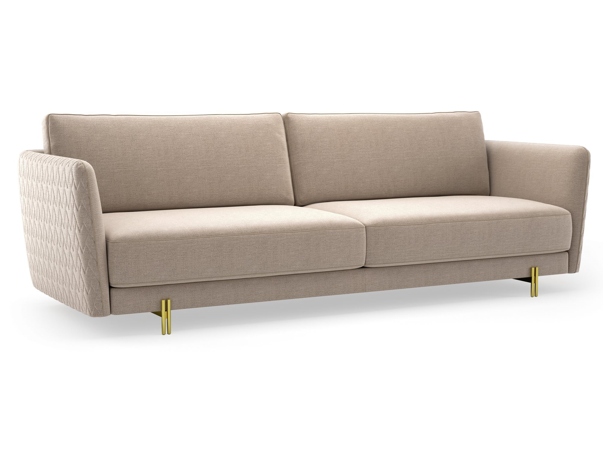 The Conrad seating system is characterised by a refined and contemporary design, emphasised by the elegant quilting that decorates the back and the armrests with enveloping continuity. A distinctive element of the sofa is the armrest section, embellished by the contrasting profile that divides the body in half. The soft seat and back cushions convey an immediate feeling of comfort and warmth. A stylish detail are the metal feet composed of rods assembled to form a light and glamorous structure.