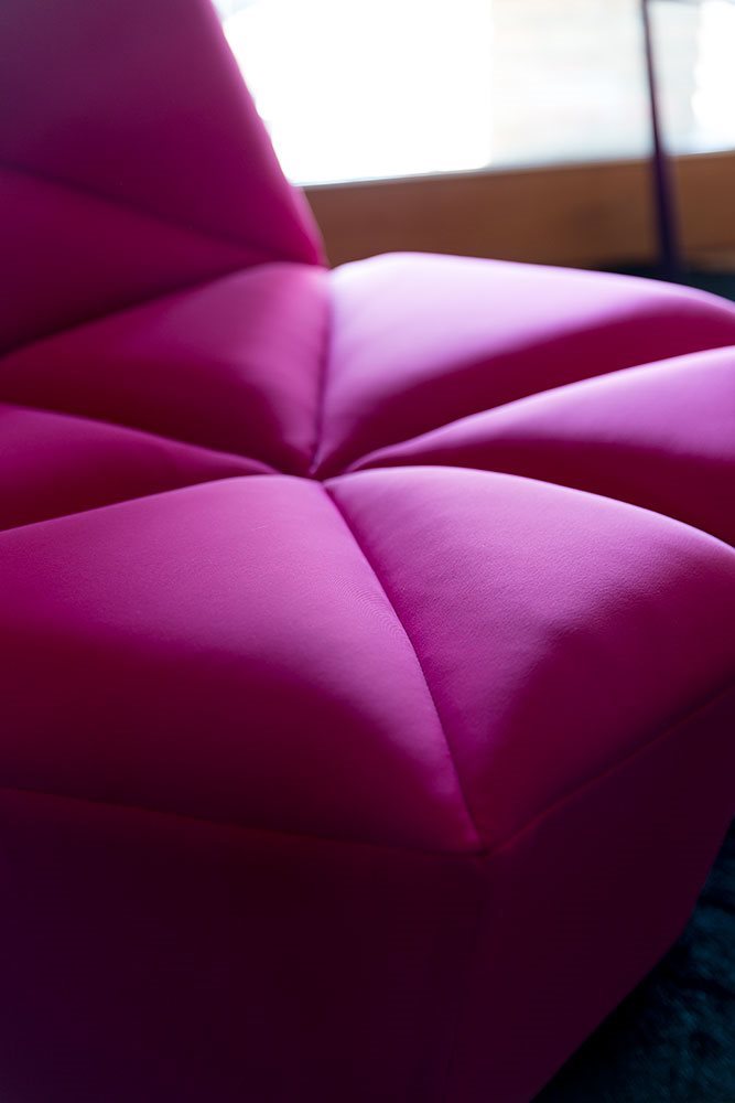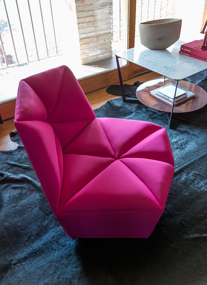 A modern armchair with ample padding, where the proportion and balance between the seat and back create a mysteriously fascinating style.The special production of the padding recalls the oriental culture of origami, where the final, seemingly simple form, exalts a highly complex and refined working method.Embracing comfort for a very original armchair, an informal and contemporary item with distinct and bold colours. A perfect union between Alberta casual design and refined, contemporary finishes.