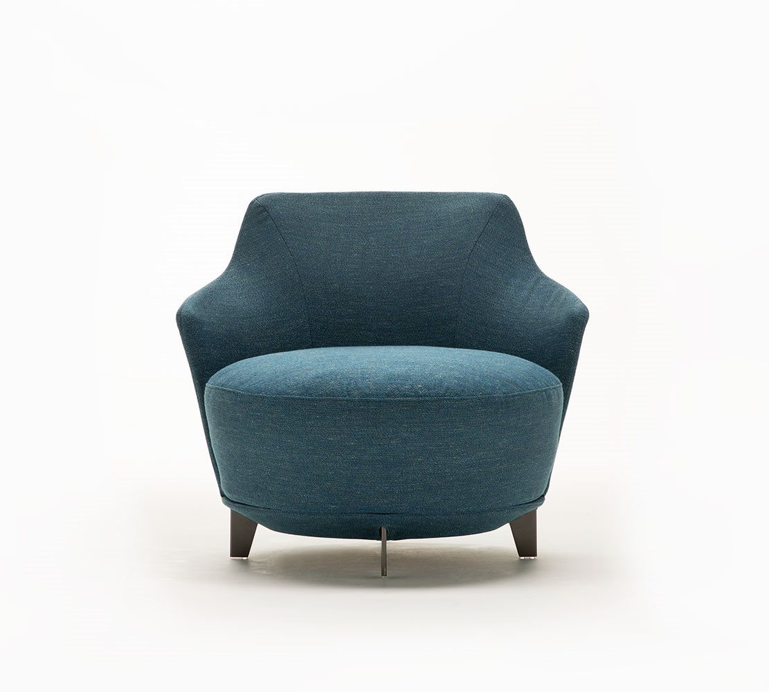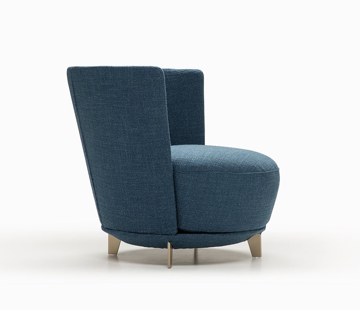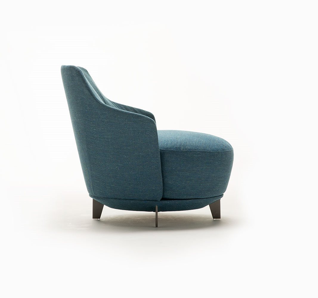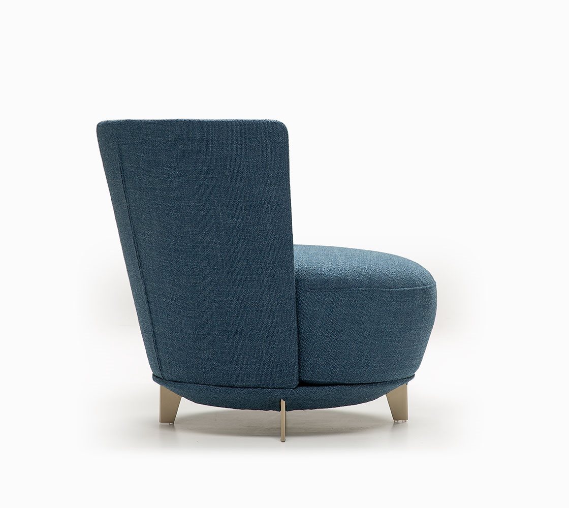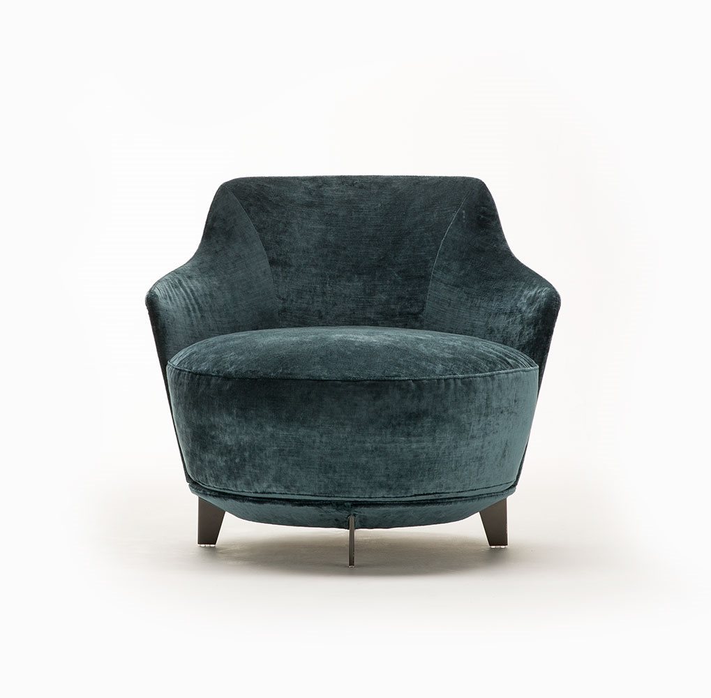 Poltrona. Struttura portante: multistrato, massello di legno. Imbottiture: Schienale in poliuretano espanso (densità 21 Kg/mc). Seduta in piuma d’oca con inserto in poliuretano espanso (densità 40 Kg/mc). Piedino: in metallo (finiture French Bronze o Gun Metal).