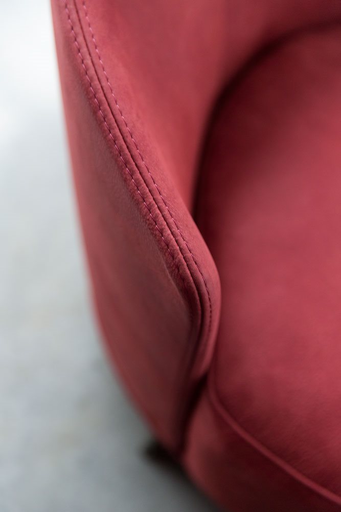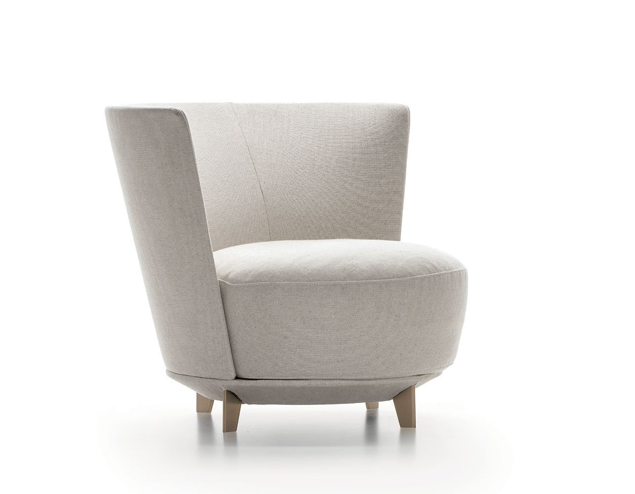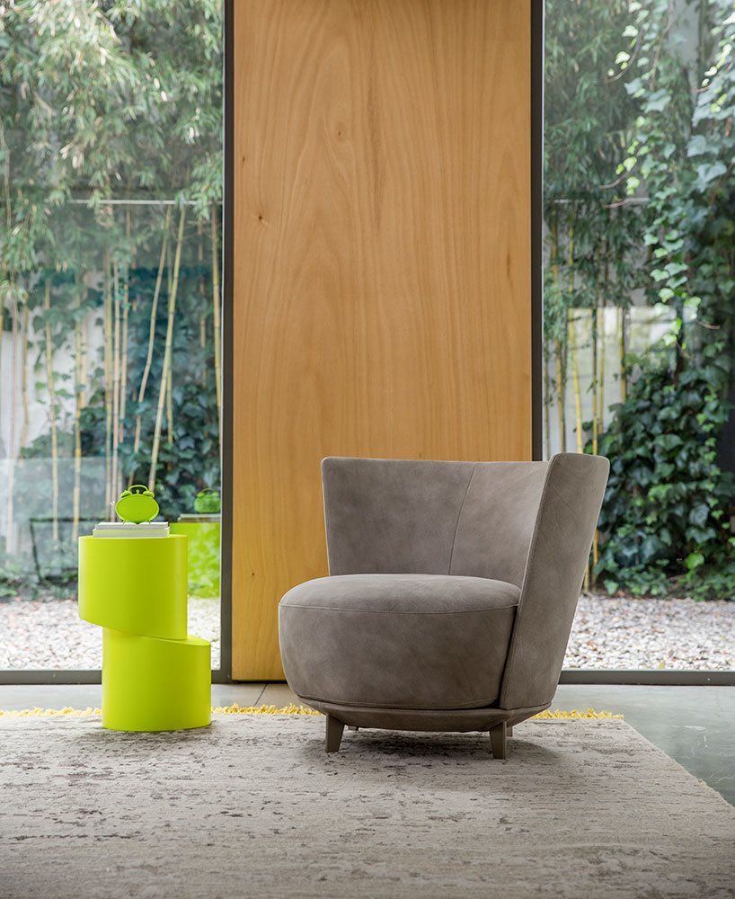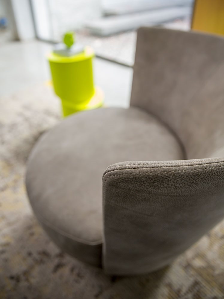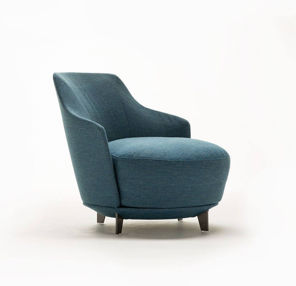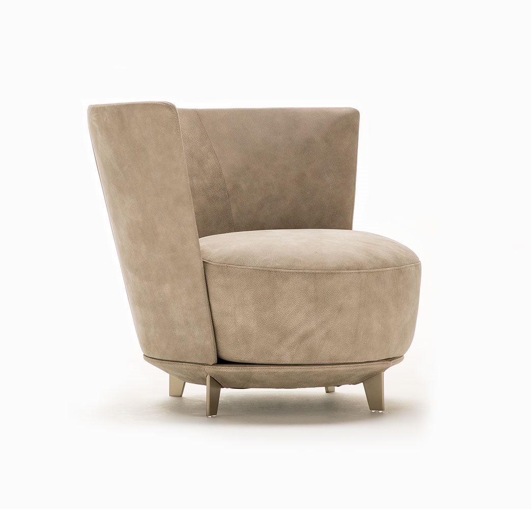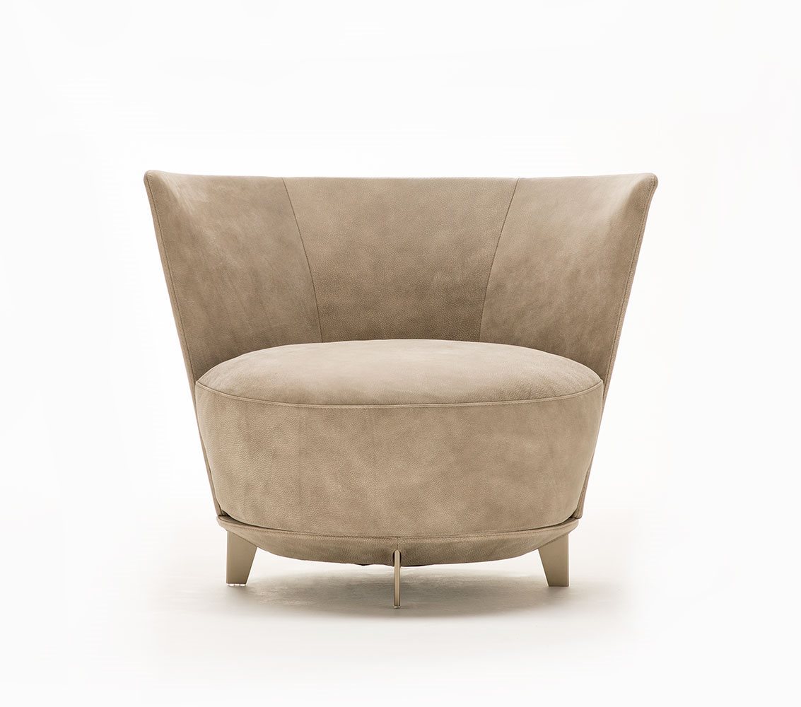 Poltrona. Struttura portante: multistrato, massello di legno. Imbottiture: Schienale in poliuretano espanso (densità 21 Kg/mc). Seduta in piuma d’oca con inserto in poliuretano espanso (densità 40 Kg/mc). Piedino: in metallo (finiture French Bronze o Gun Metal).