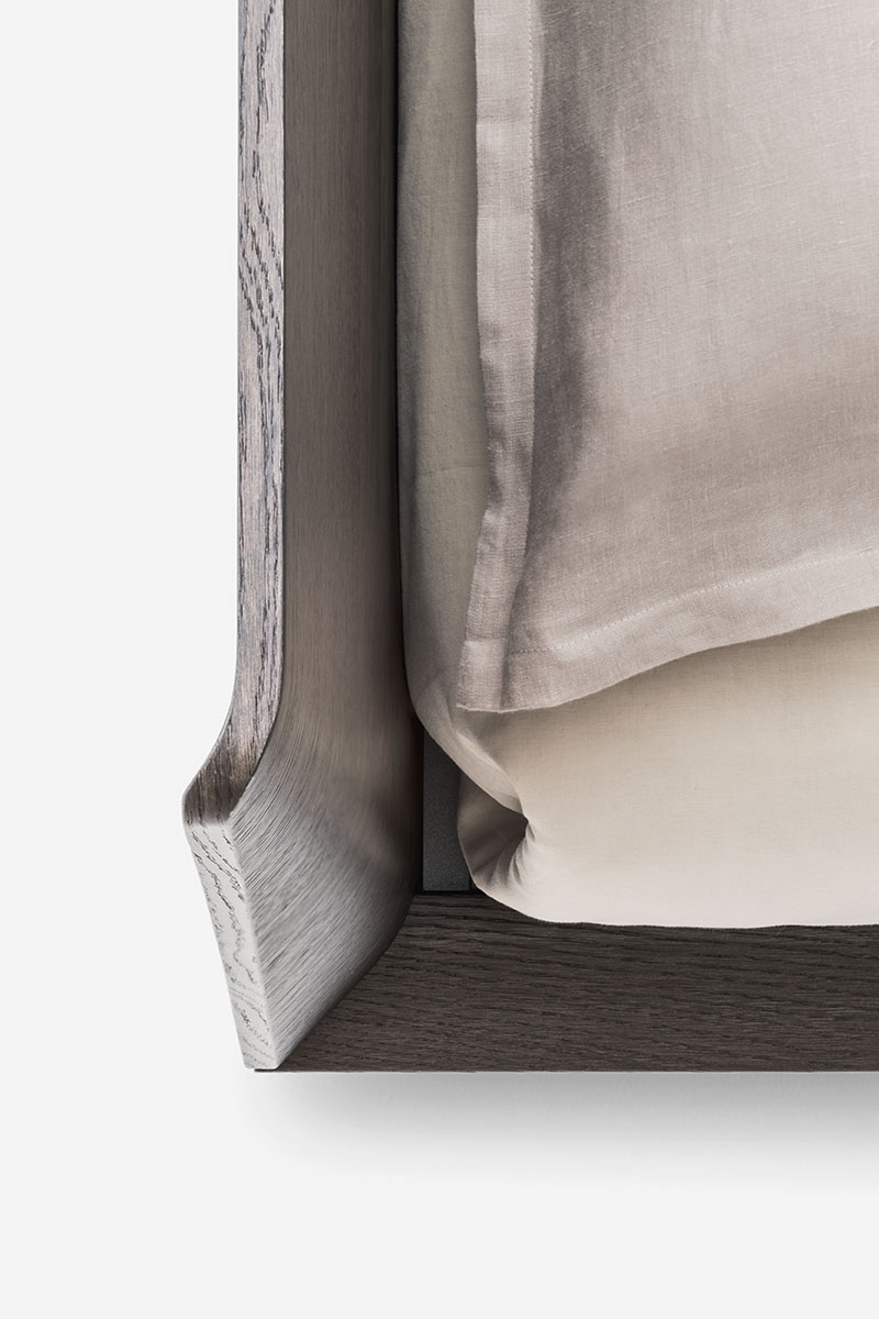 The Xilo bed has a wooden frame and metal feet. It stands out for the rounded headboard sides and for the bold yet light-weight shape of the platform.