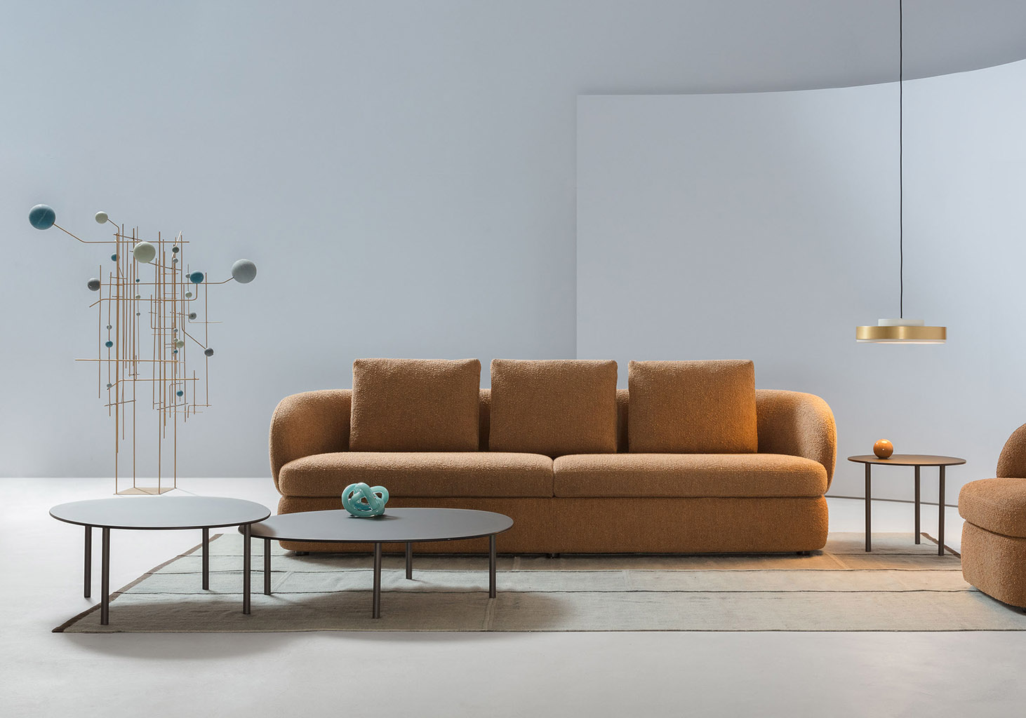 Sobi is a diverse collection of upholstered furniture made up of sofas, a single chaise longue, an armchair and a footstool. The collection represents a continuation of the journey, which began with the Raku collection, to create a sophisticated yet homely dimension of comfort. SOBI is substantial in size and has soft, organic shapes.
