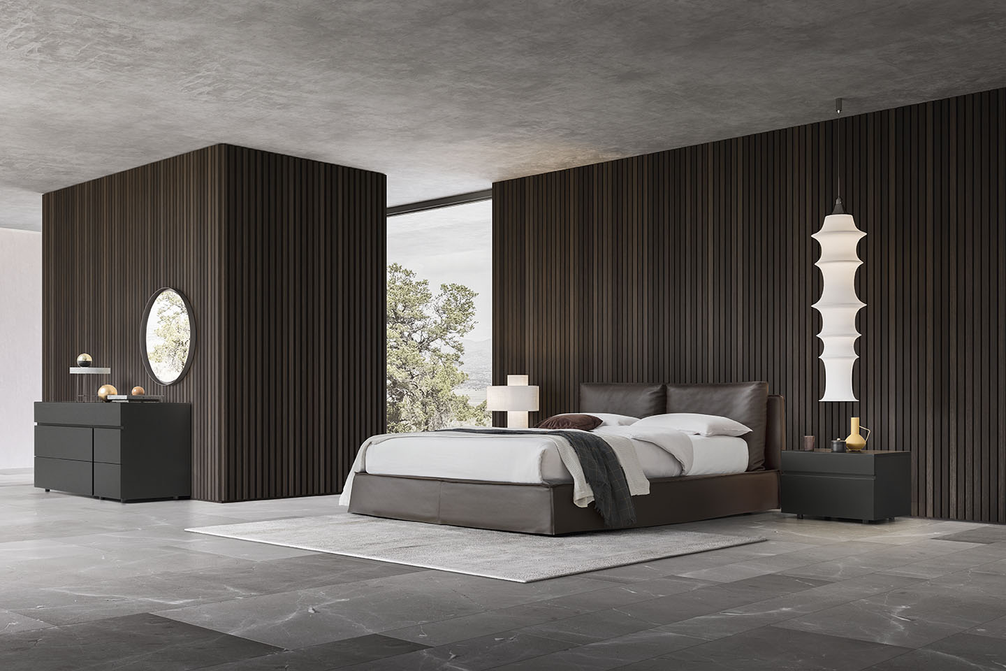 Featuring unusual, raw-cut stitching in the leather version which defines its edges, the Milano upholstered bed is both elegant and original. The soft cushions of the headboard rest on each other, creating a pleasing play of levels. This modern upholstered bed comes in a wide range of sizes, including with storage.