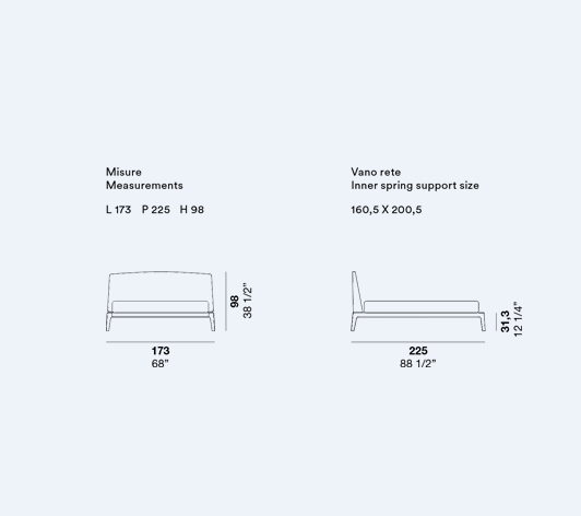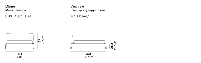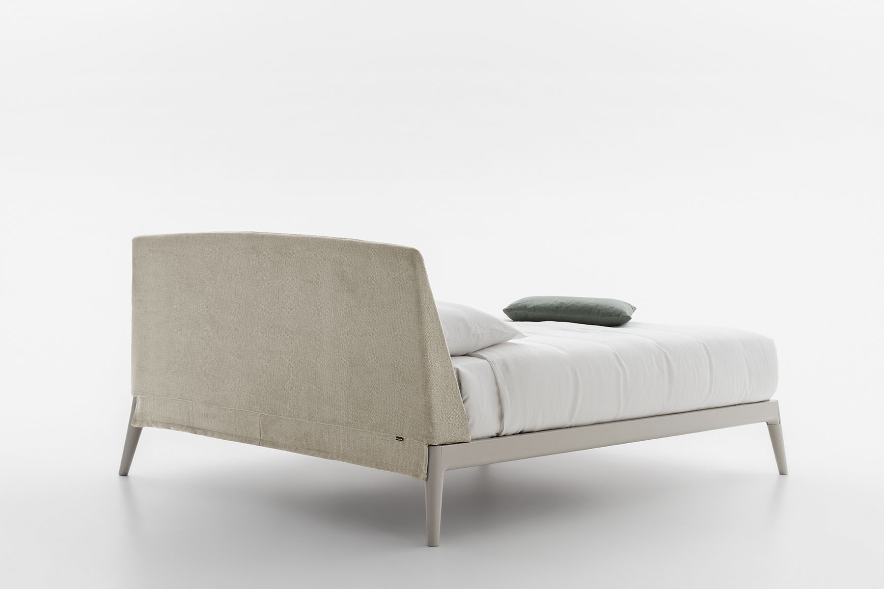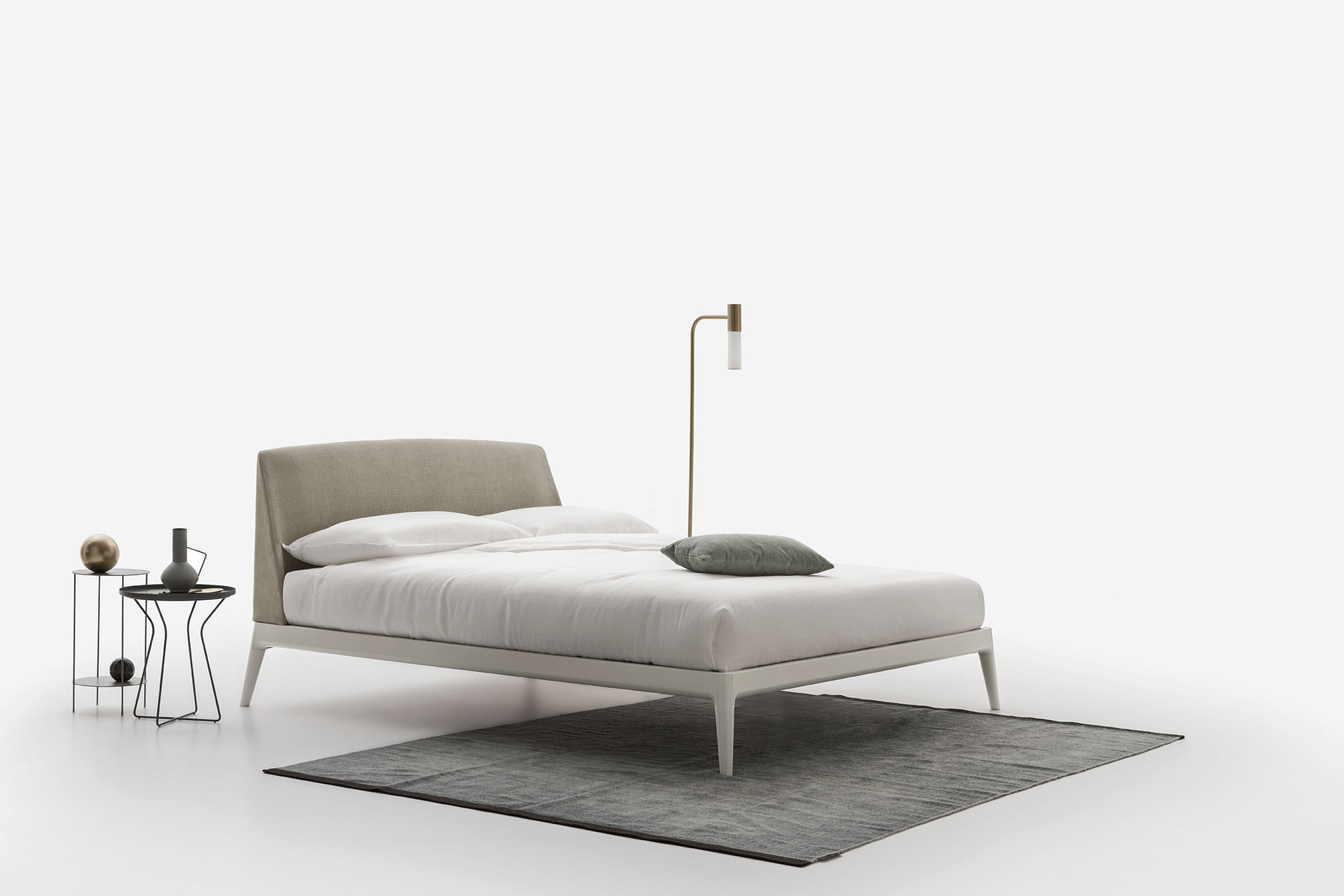 Ecate is a comfortable wooden double bed, featuring a slender wooden frame defined by soft joints, with the option to customise the exposed legs. The fabric headboard, simple and slightly curved, gives the bed its refined charm.