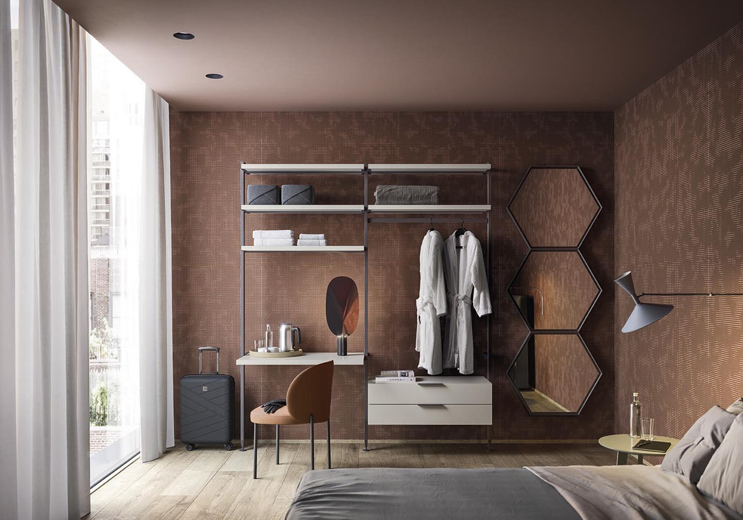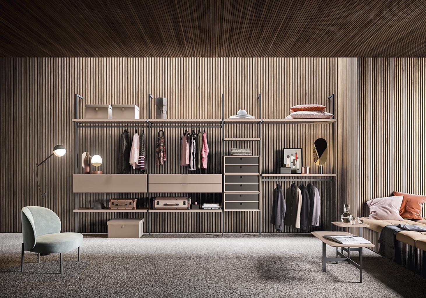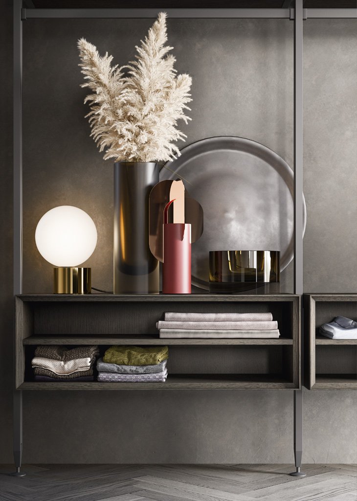 Antis is a designer walk-in wardrobe, made up of uprights that can be accessorised, and is characterised by great freedom of choice in terms of height and position of the elements, with the opportunity to create multiple configurations.