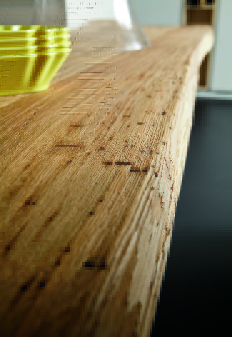 A 45 mm thick top in solid oak with uneven edges.