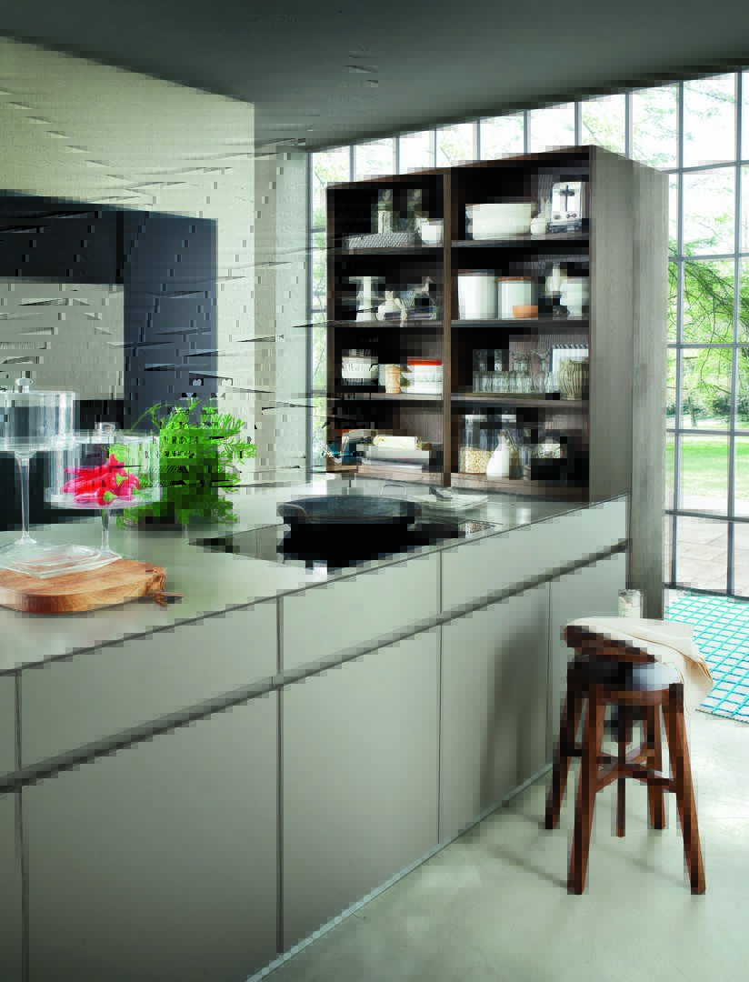 Open tall unit with shelves, in solid oak with Grigio finish. Placed in a modern context and used as separator between the stove and living room.