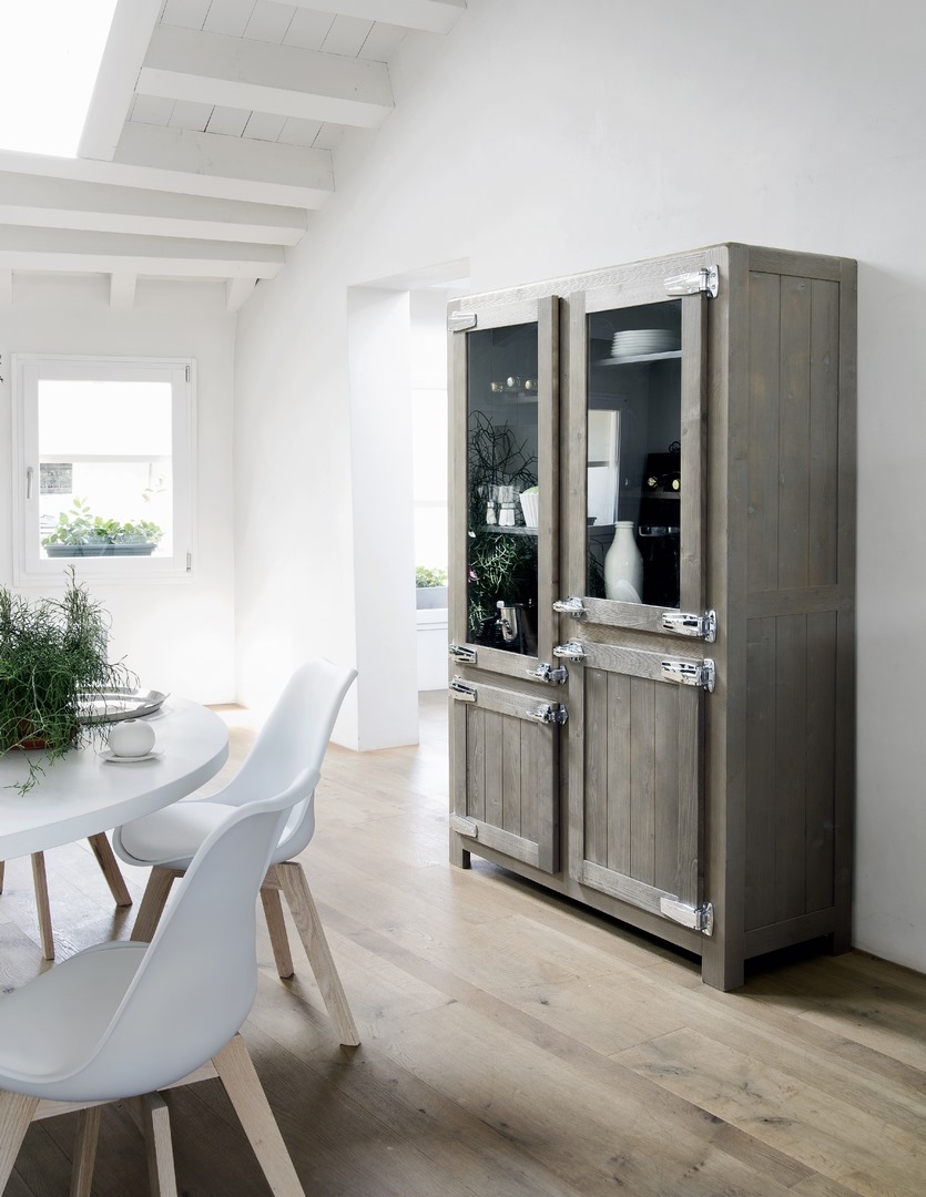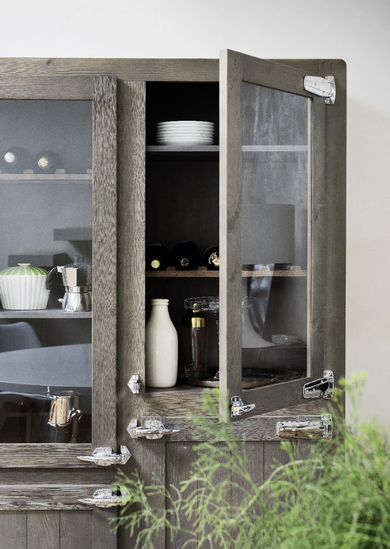 Easy unit in solid brushed spruce, Cenere finish, with 4 doors and chrome handles. The upper two doors are with transparent glass.