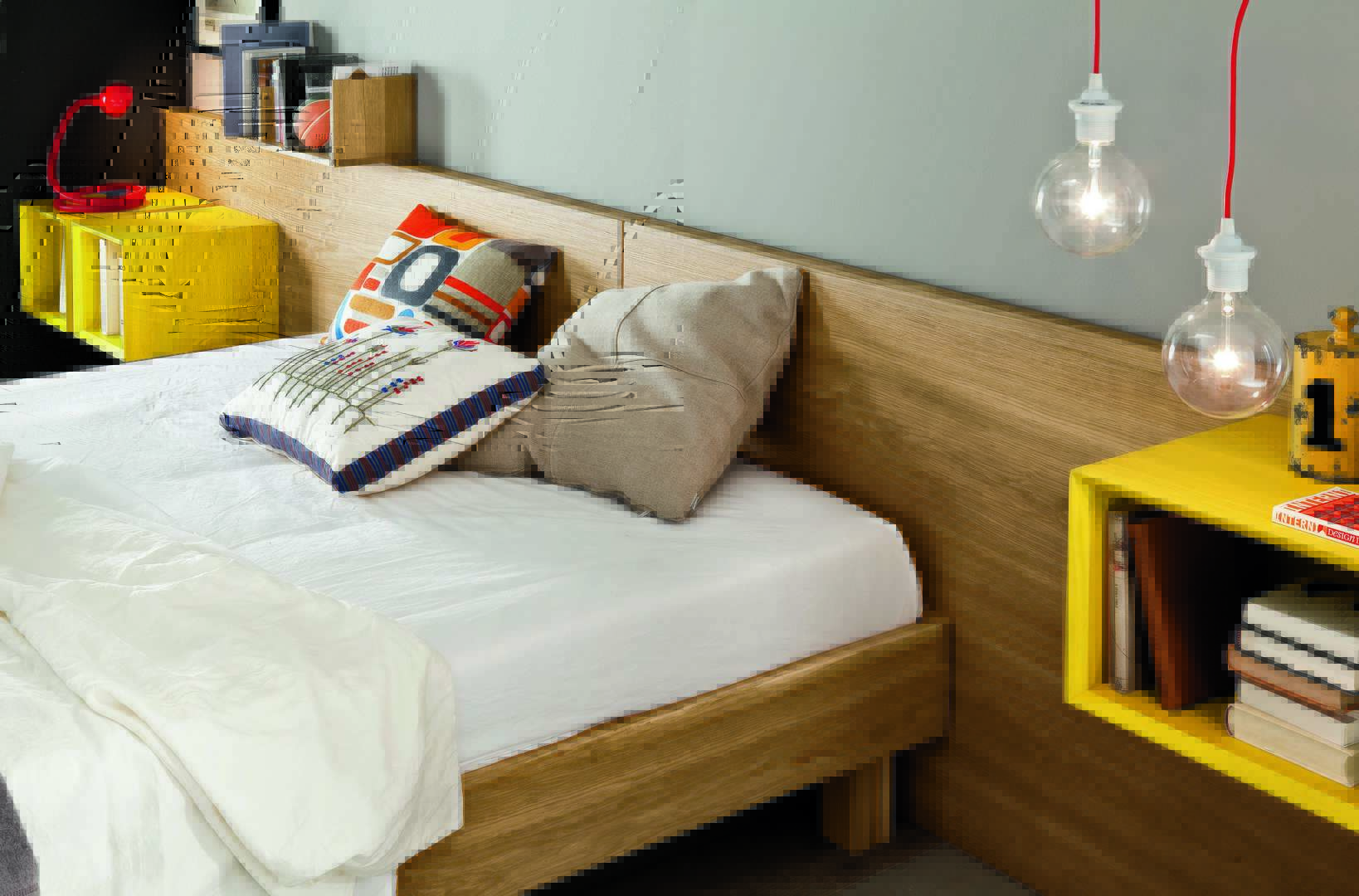 Complete the space an Nook open cubes, used as bedside tables and storage shelves with RAL finish.
