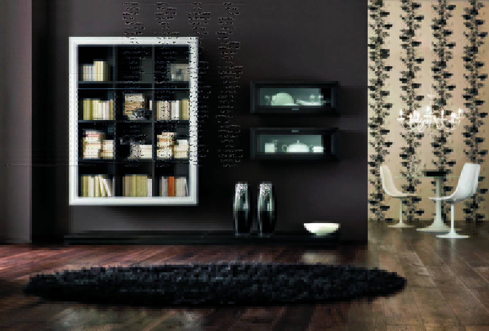Composition MD002, made of 2 bench on the ground, one vasistas unit, one hanging cabinet and one suspended bookcase.