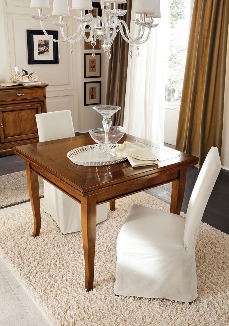 Square table with two 400 mm long, pull-out extension leaves.