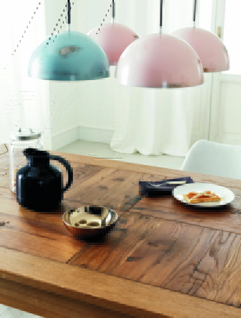 Extending Dublino table in distressed oak veneer, with Wave chairs.