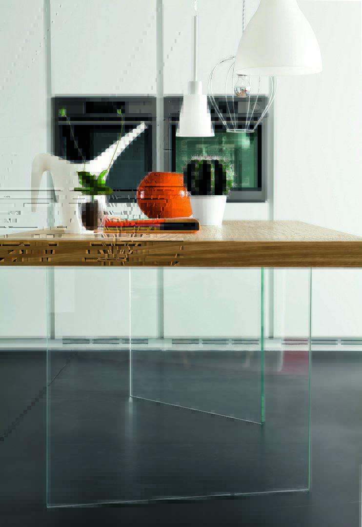 Nizza table made of 64-mm thick top with a multilayer core, covered with 30/10 extra-thick European oak veneer on the top; in Naturale finish.