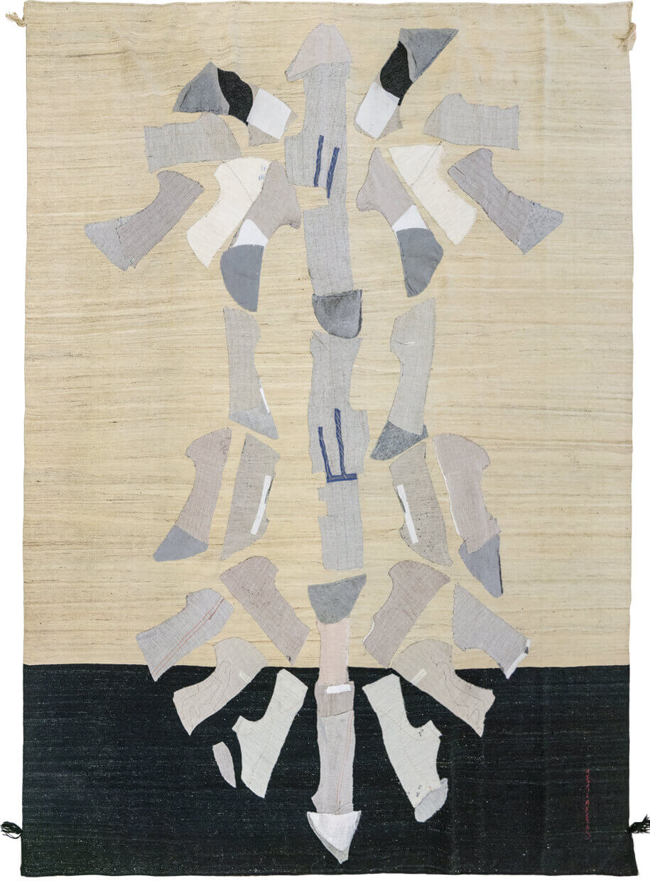 Kilim afgano intrecciato a mano in lana con ricamo originale realizzato nell’atelier Antonio Marras in Sardegna. Solo i tre colori base – nero, bordeaux, ecrù – sono stati concordati. Su questi kilim Marras ha lavorato come se fossero delle tele; ma, invece di dipingerle, vi ha appoggiato dei frammenti, ?delle idee?, che poi delle abilissime ricamatrici di Bitti, un borgo della Barbagia, hanno fissato a mano, punto per punto. I “frammenti” che lo stilista ha impiegato sono, racconta egli stesso, ?gli interni delle giacche, le fodere: le tele che rivestono e rinforzano le strutture dei miei abiti. Ho lavorato con il dentro, con i pezzi di risulta, con quanto di solito è destinato a essere buttato, annullato, e che invece ho ripreso e rimesso a posto, rimodellato, riassestato.?