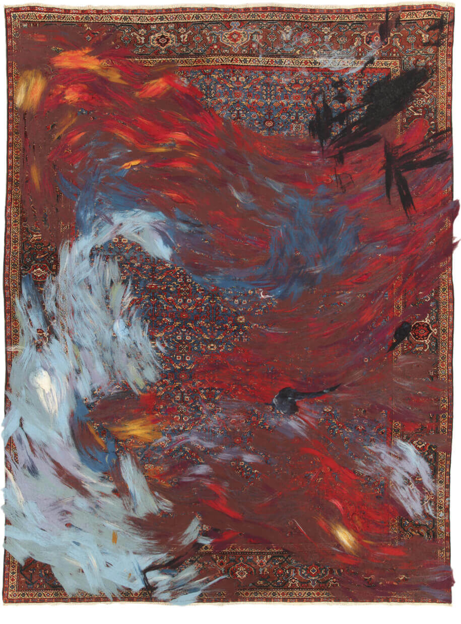 “The original idea came about from a collection of antique Persian rugs that I acquired from an estate sale of the prior owner of my current studio, Pat Passlof, an abstract expressionist painter. With several of these lying around, I began to study them and became fascinated with the history of the Persian carpets and how the identity of rulers, regions, towns and even nomadic tribes were linked to the unique variations in patterns, colors, and weaving techniques evident in the carpets. So I began an extemporaneous process of applying, layering and infusing vibrant wool fibers on the traditional hand knotted carpet sort of like the ductus of a painter’s palette knife and brush on a canvas creating movements and textures of clotted, caked sculptural surfaces.”