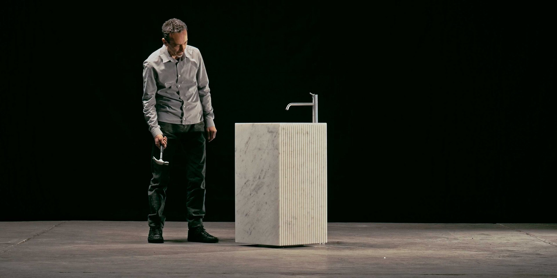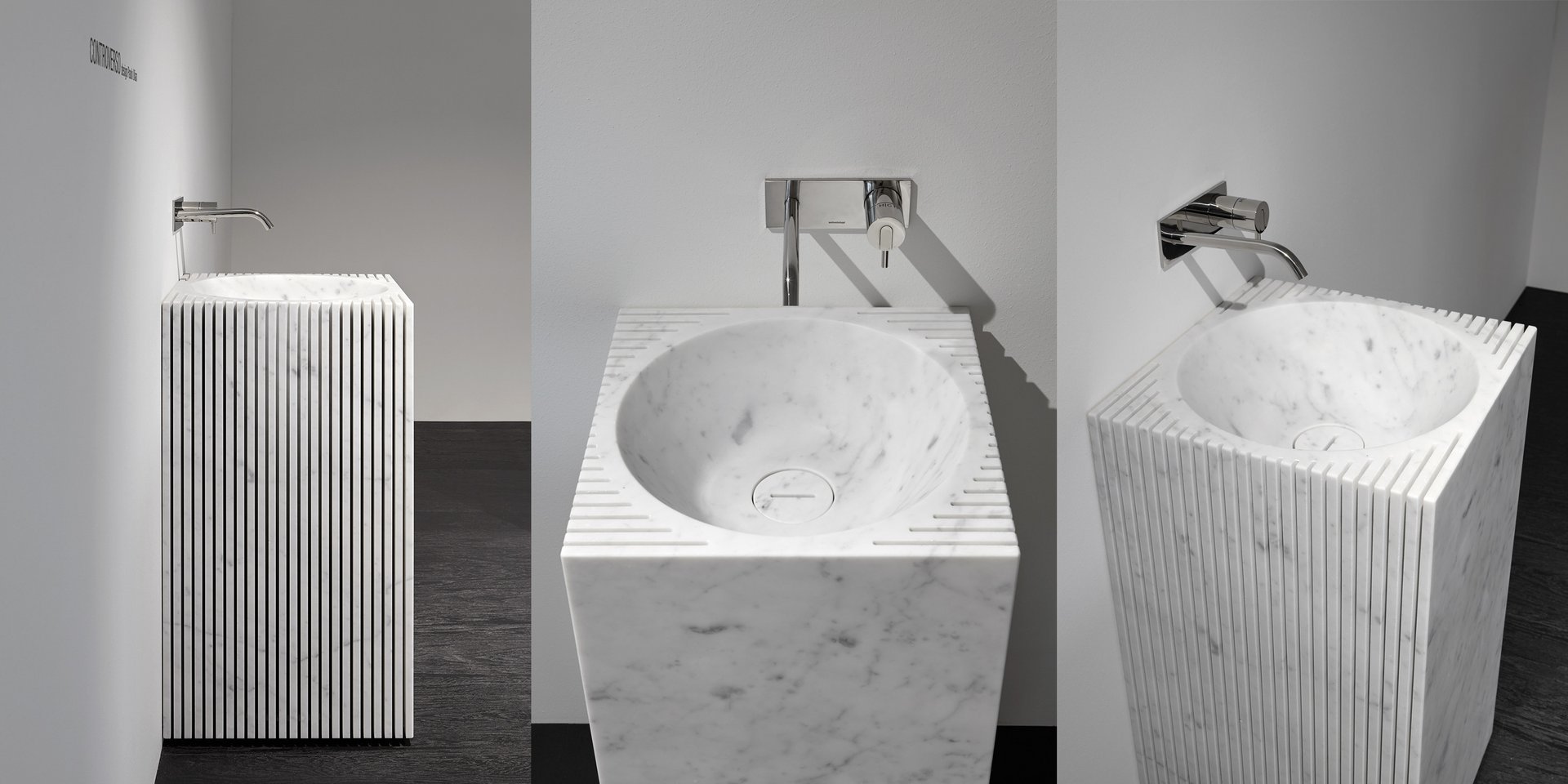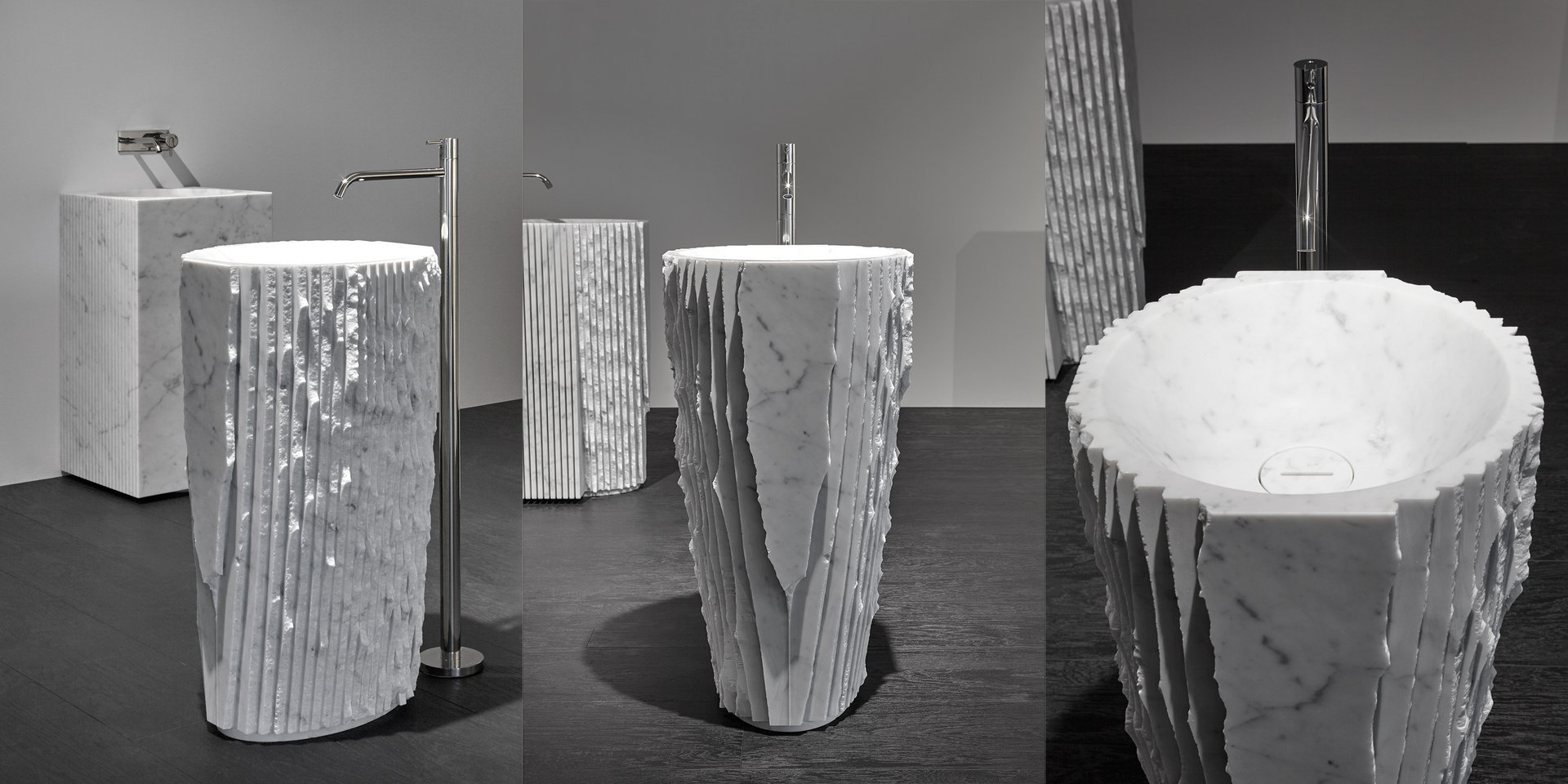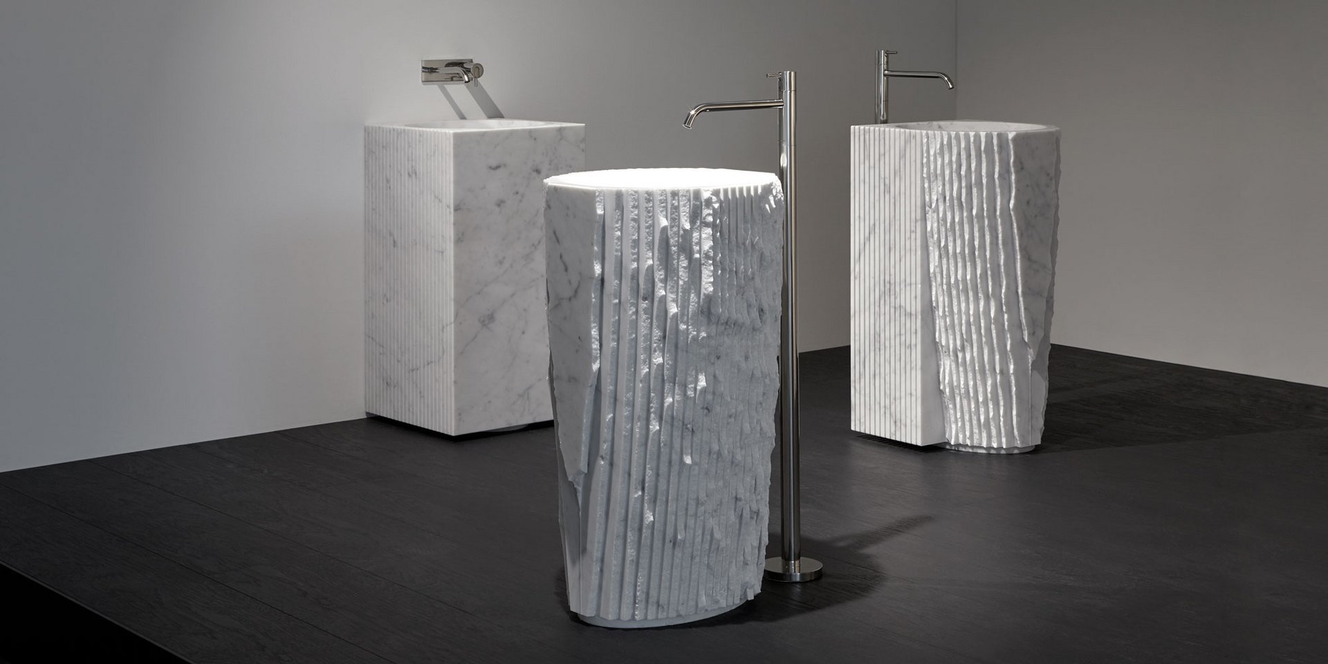Freestanding stone sink, complete with drain pipe fitting and open plug, trap and flexible hose.