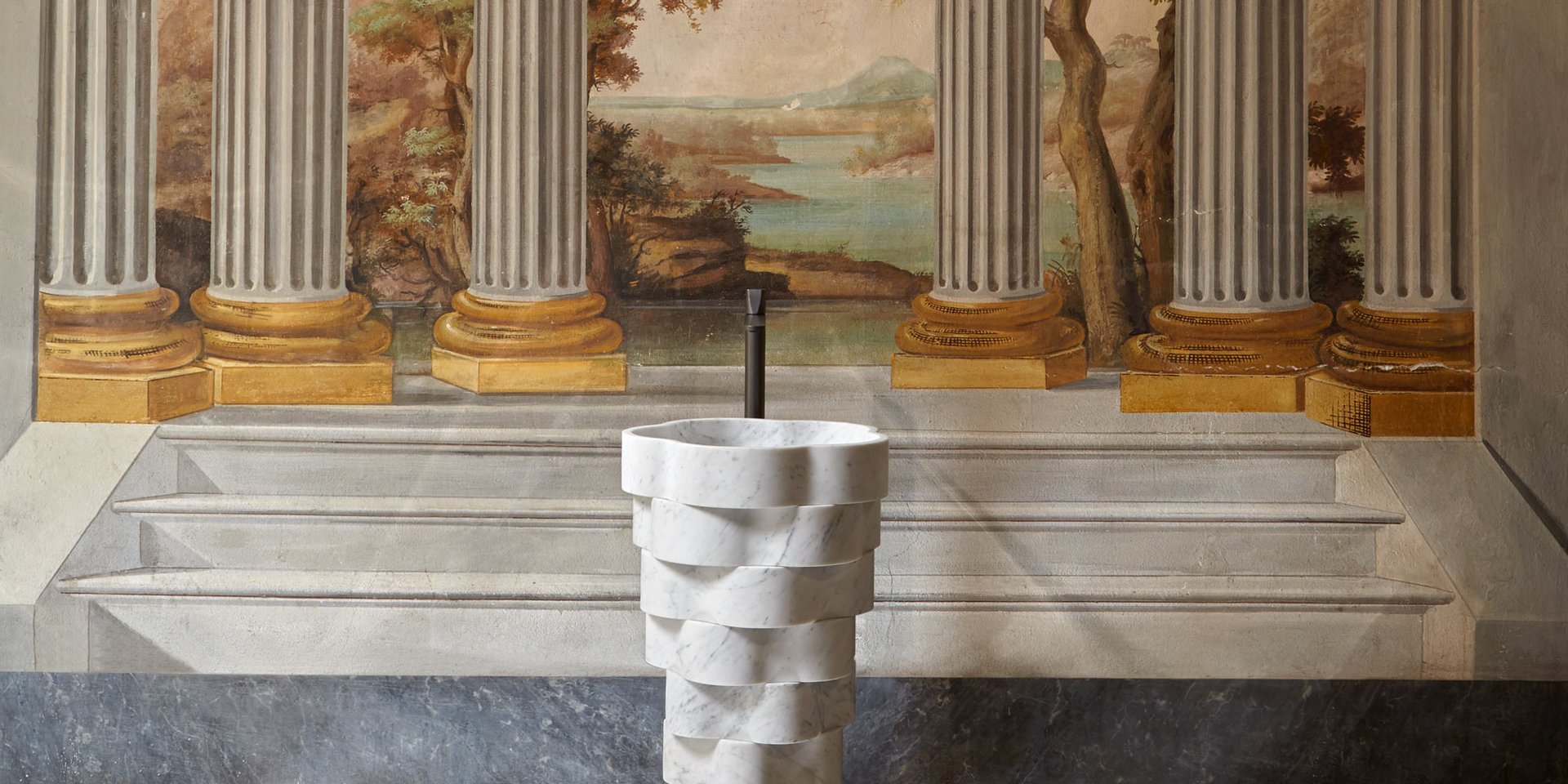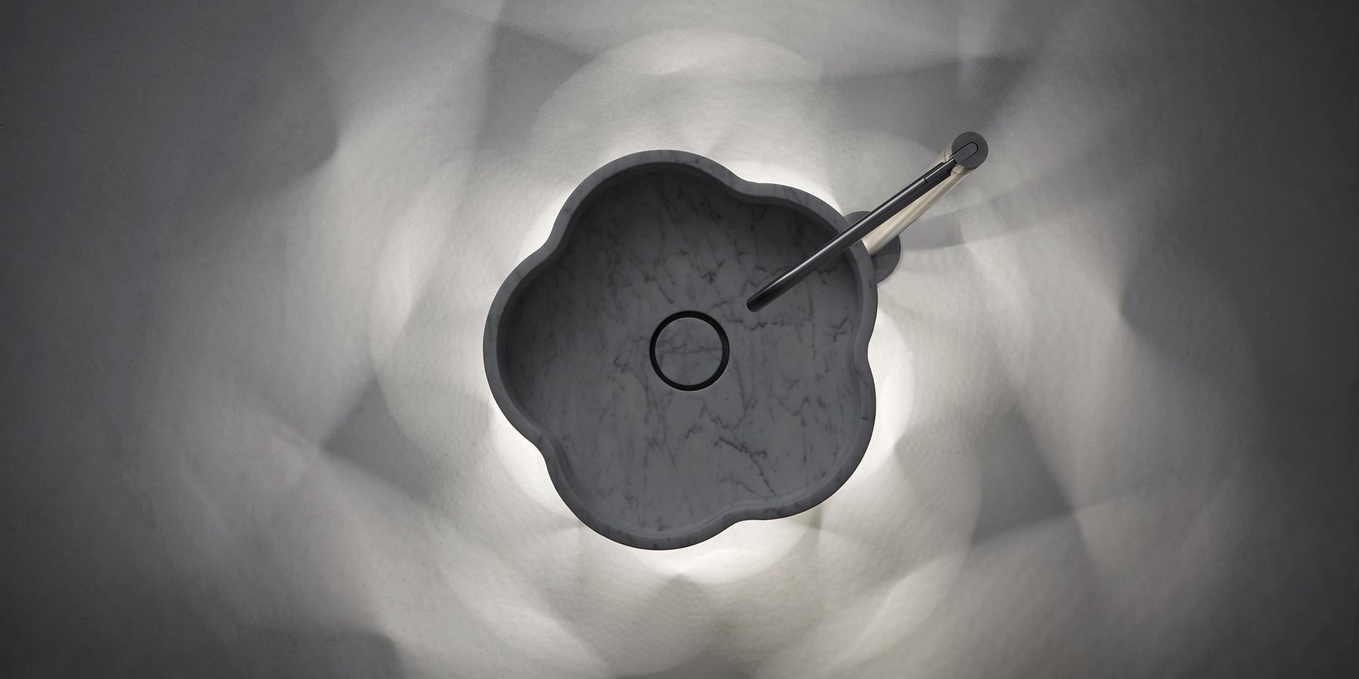 Freestanding stone sink with floor drainage complete with open plug, siphon and rigid hose.