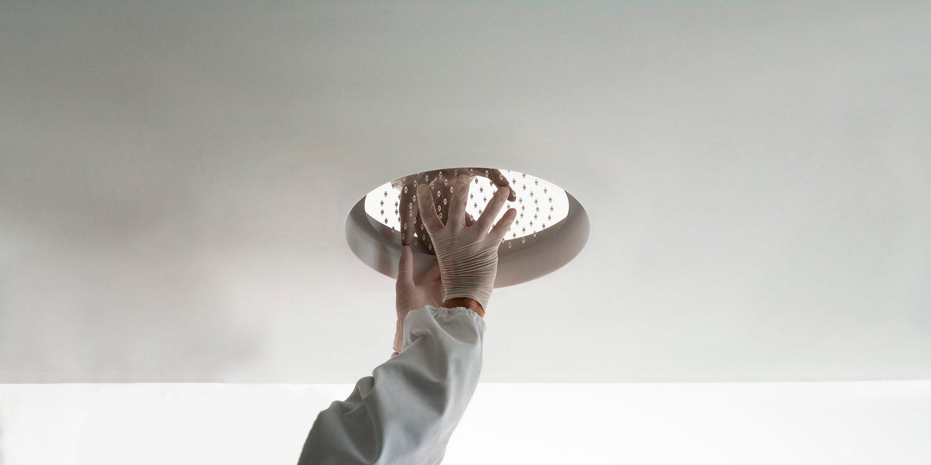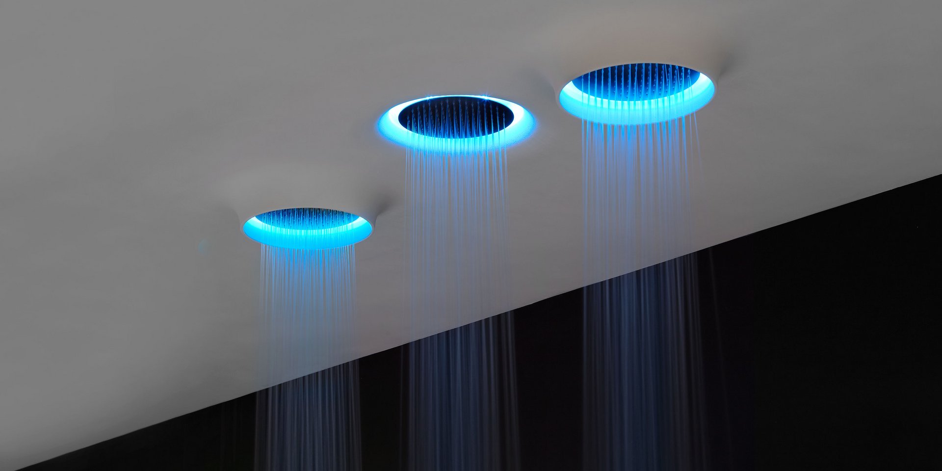 Encased Flumood? frame with stainless steel AISI 304 showerhead, with possible LED RGB lighting complete with waterproof remote control.