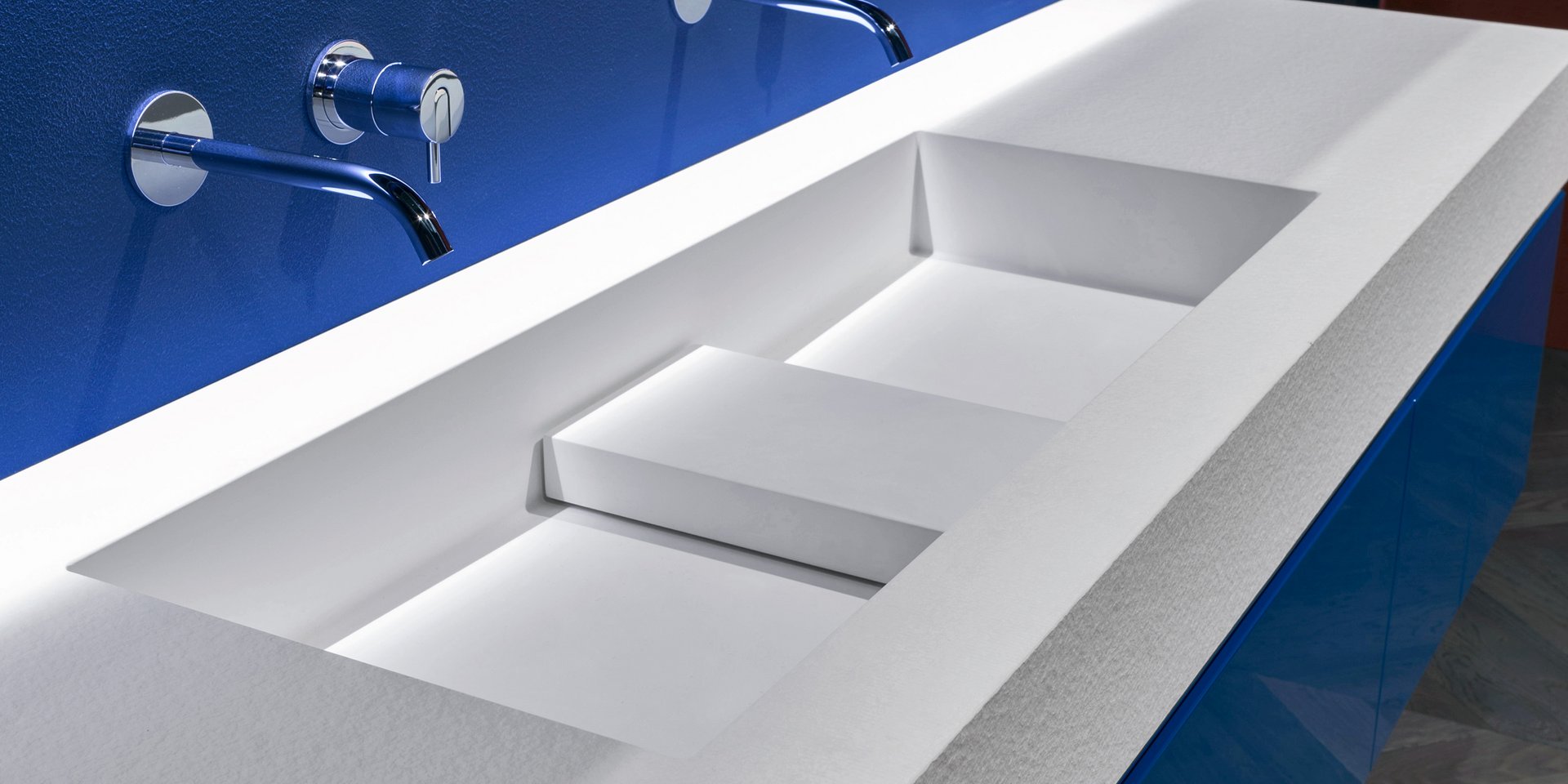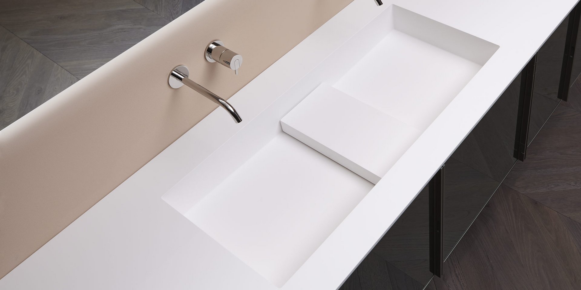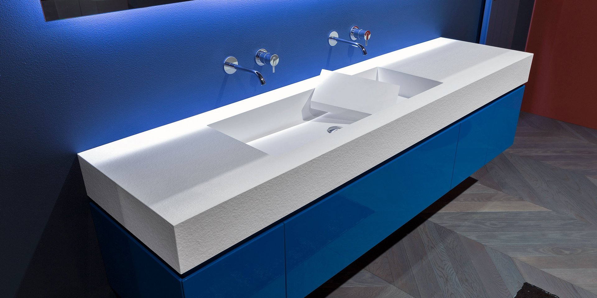 Top with integrated sink in Flumood? Texture finish, 125 mm thick complete with drain pipe fitting and open plug which may be wall mounted or used on furniture.