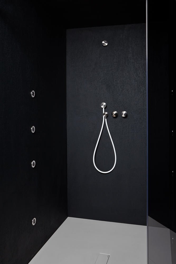 Side rain jet to be encased. Satin stainless steel AISI 304 and black Delrin