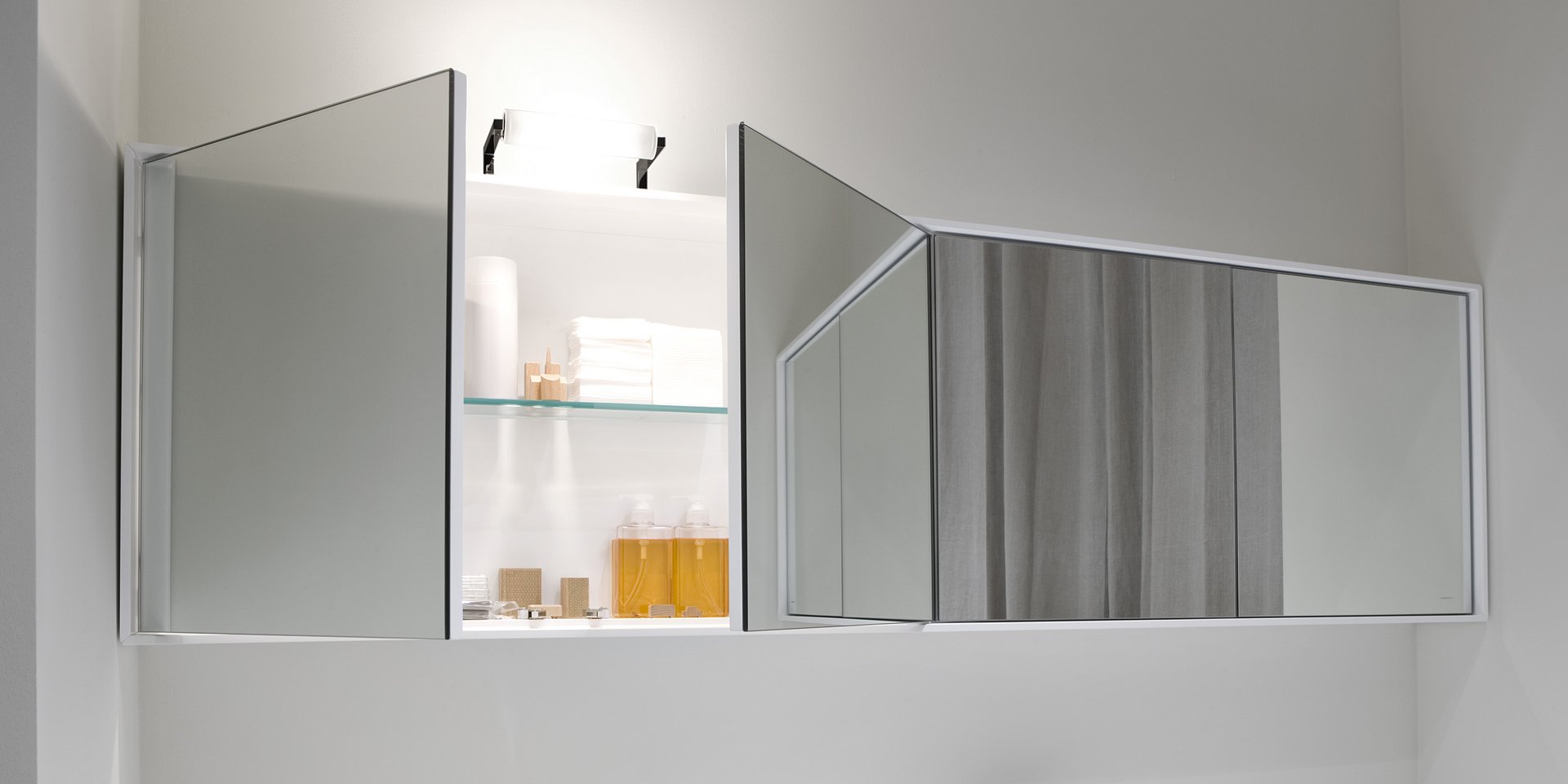 Right or left wall cabinet with face mirrored door and internal shelves.