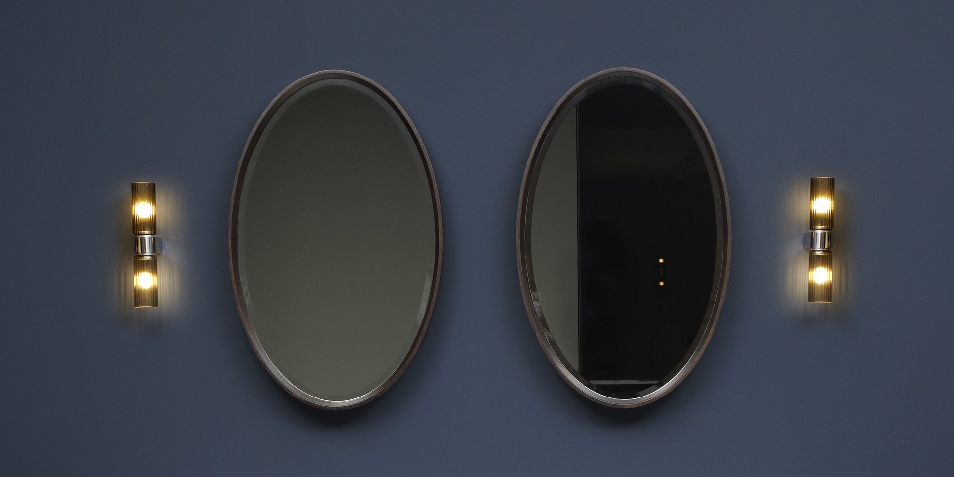 Horizontal or vertical oval beveled mirror with solid wood frame.