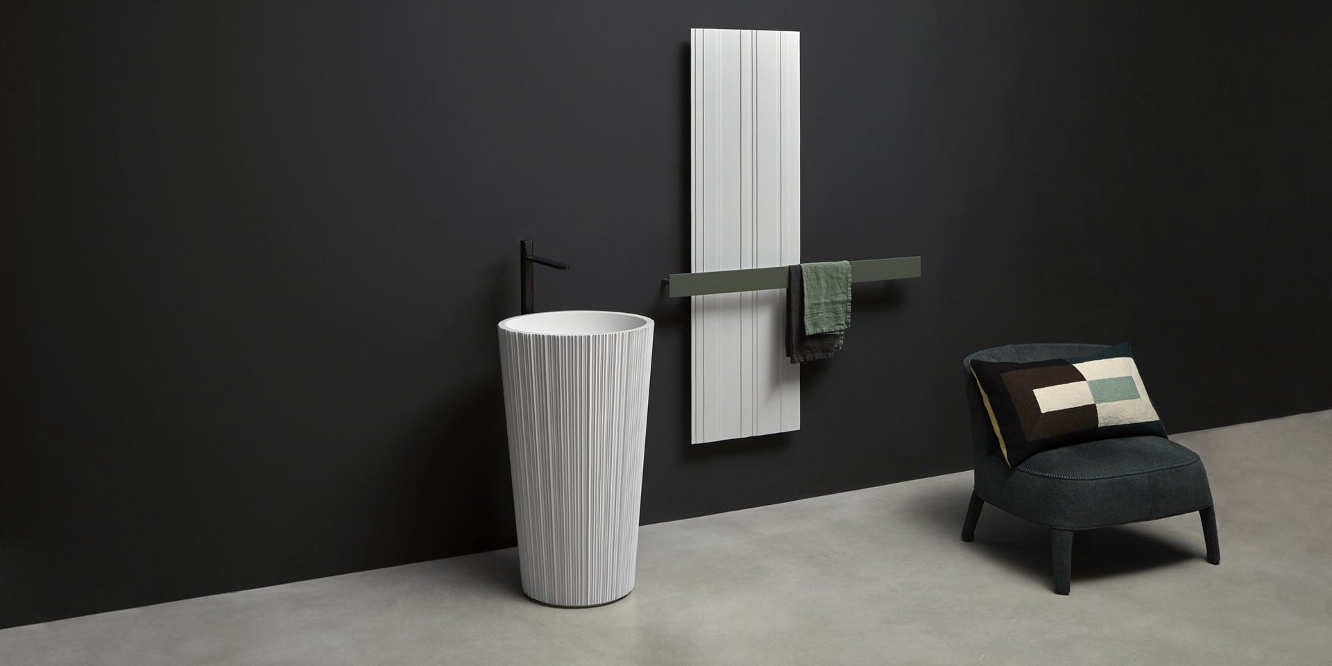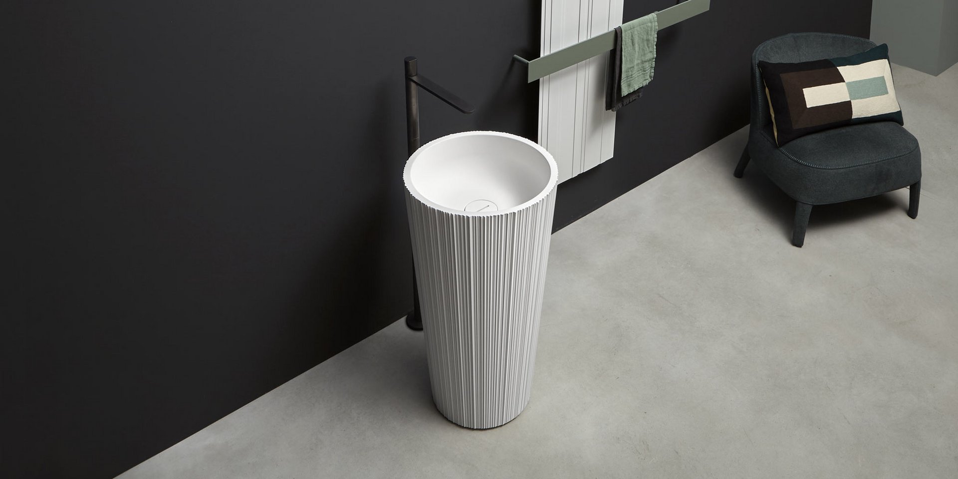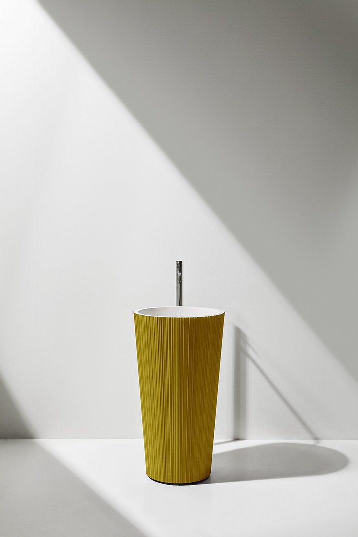 Freestanding flumood sink with floor drainage complete with open plug, siphon and flexible hose.