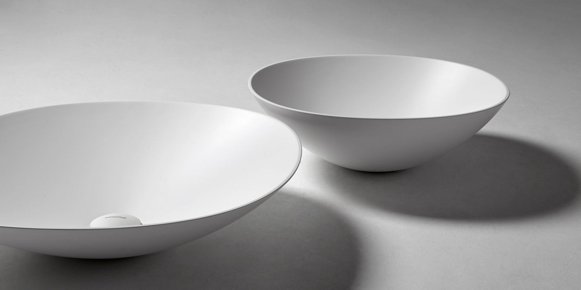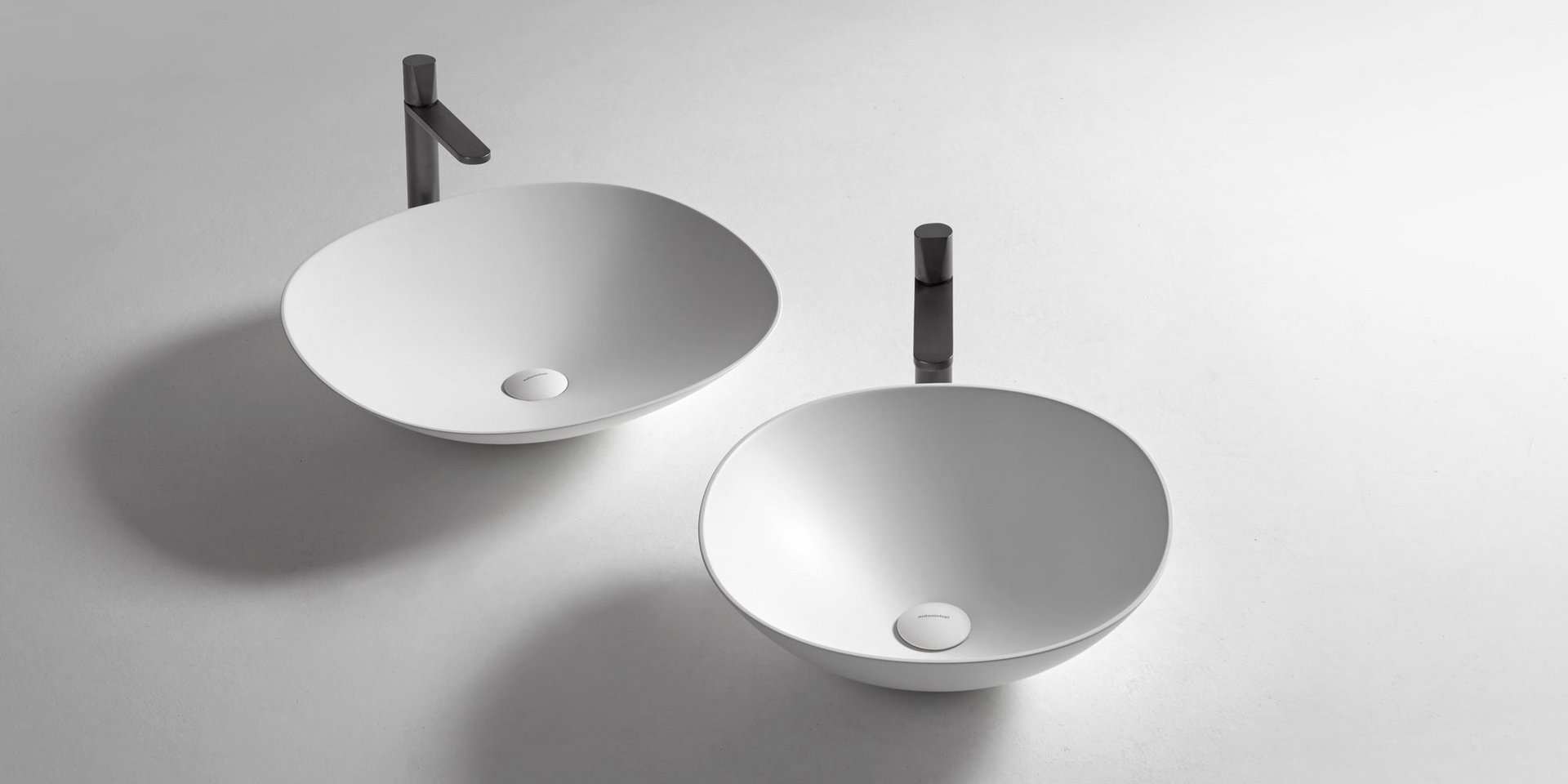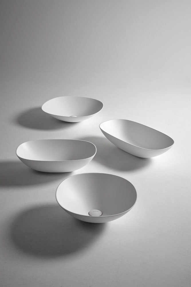 Round top mount Flumood, can be externally lacquered in all colors of our collection or Ceramilux sink complete with drain pipe fitting and open plug.