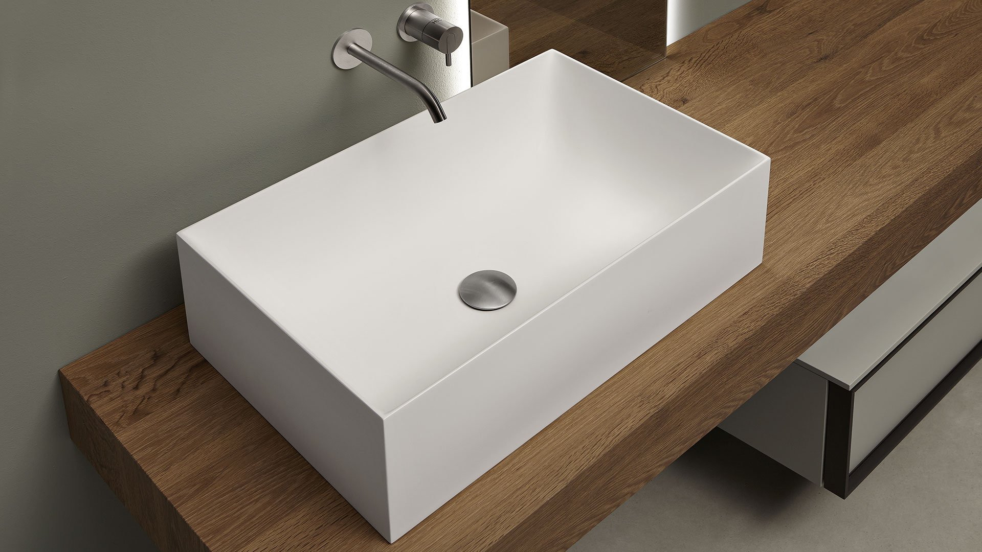 Square top or wall mount Flumood sink, complete with drain pipe fitting and open plug. Can be lacquered externally.