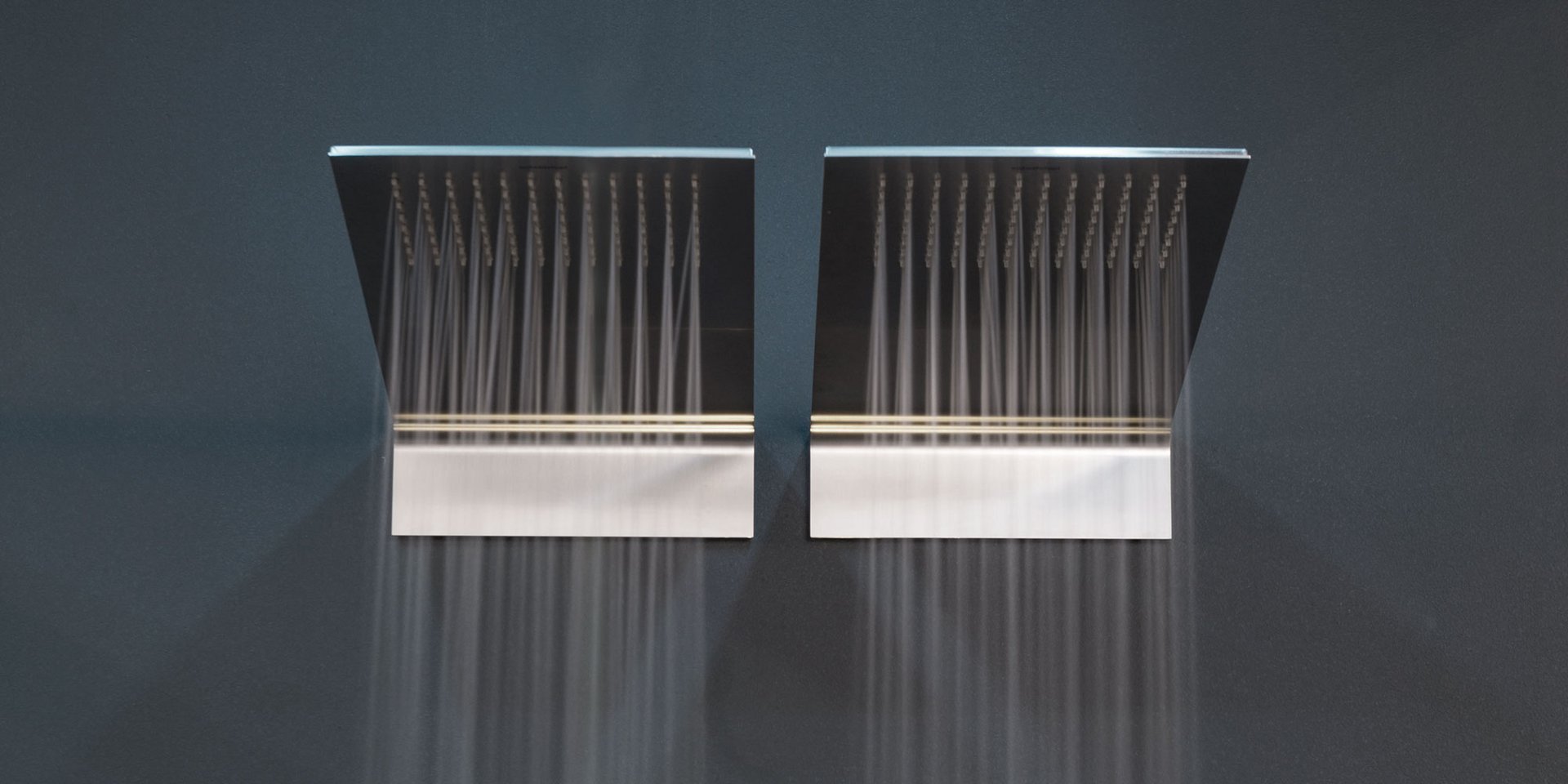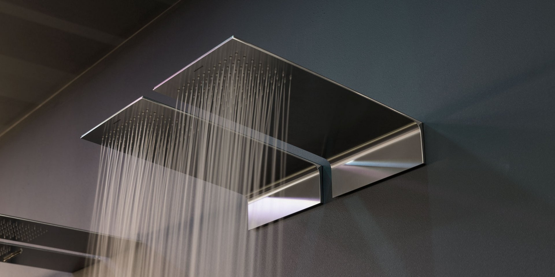 Satin stainless steel wall mounted showerhead.