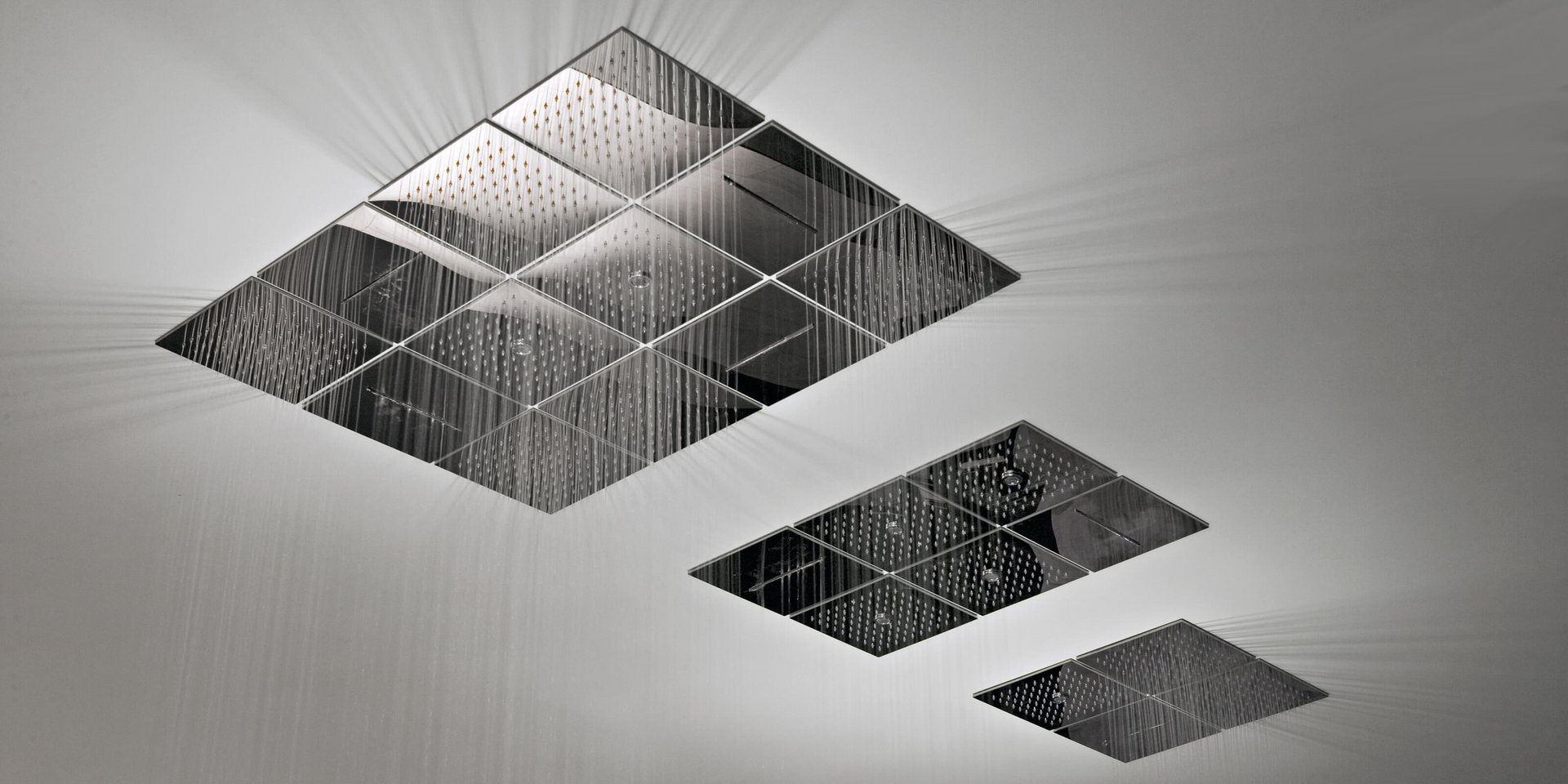 Encased modular showerhead with waterfall in polished stainless steel AISI 304.