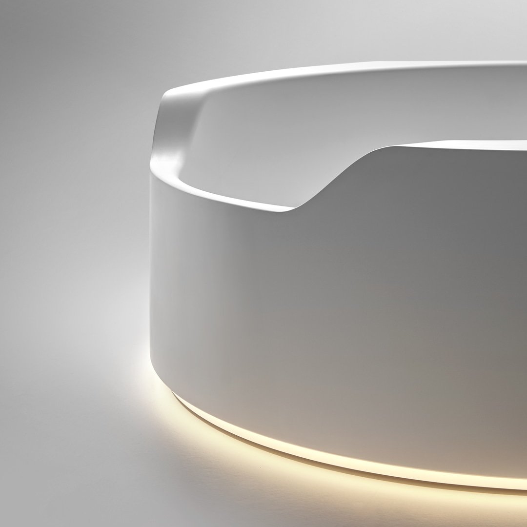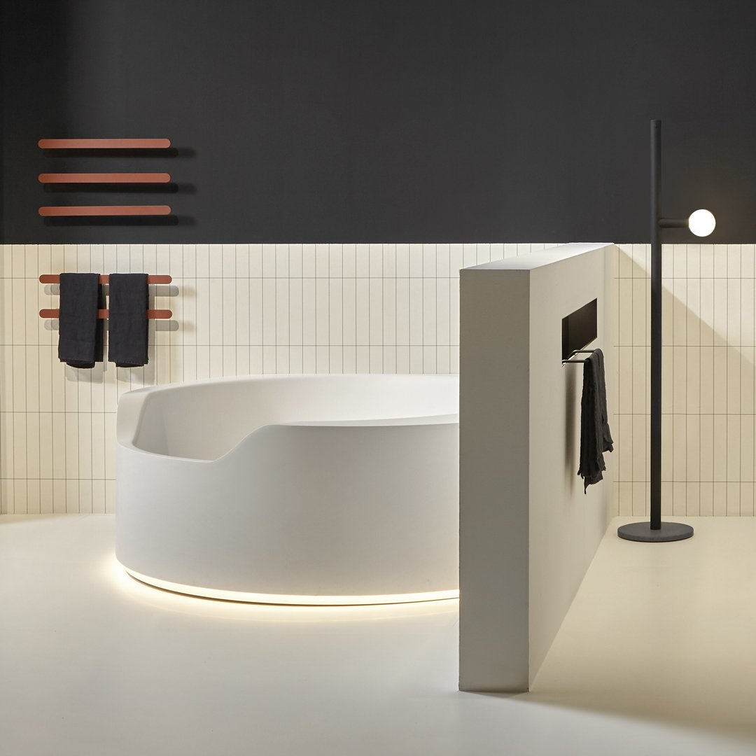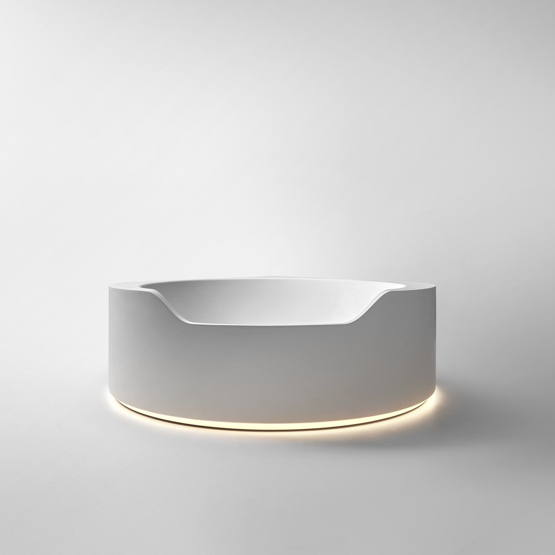 前面較低的邊緣邀請您進入,讓您完全沉浸在獨立式版本中,當它凹進地板并呈現(xiàn)一桶天然水的形象時。Ofuro 由 Flumood 制成,邊緣厚度可變,某些部分較寬,因此可以支撐物體和身體護理產品,其他部分較薄以減輕氣勢磅礴的體積。浴缸可以配備集成在底座上的 LED 燈,營造出優(yōu)雅、輕盈和懸浮的感覺。