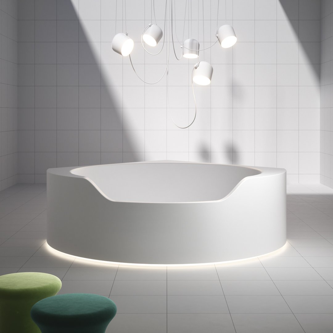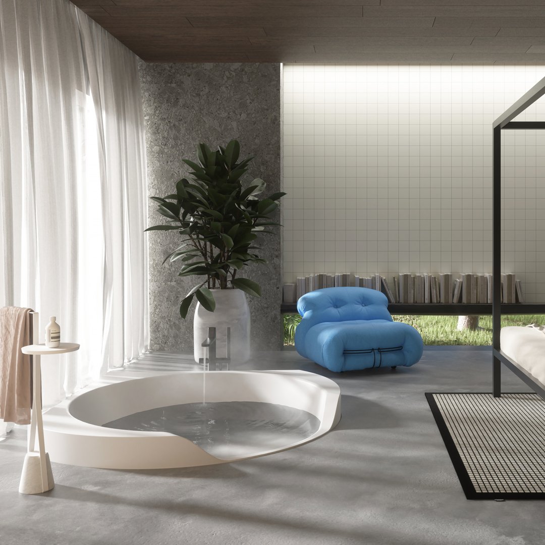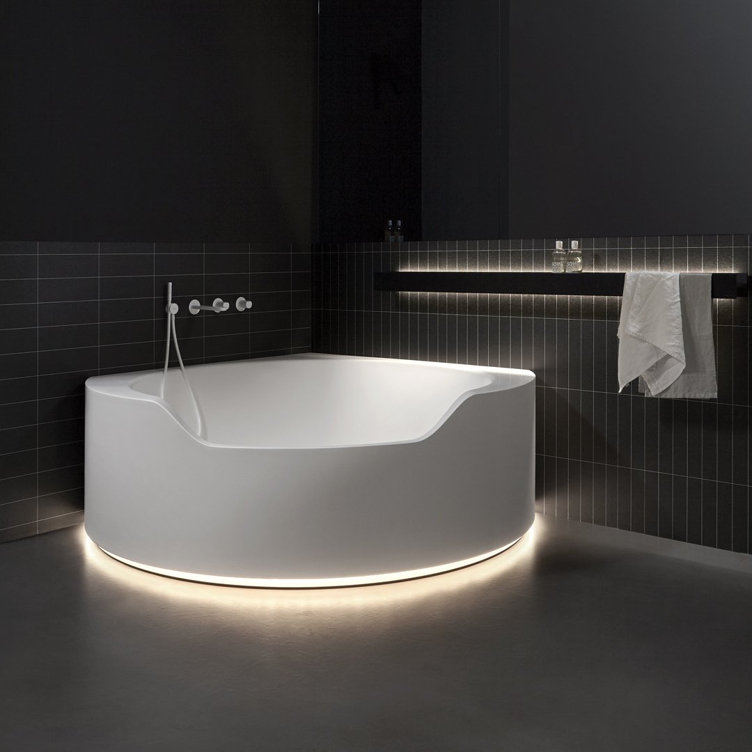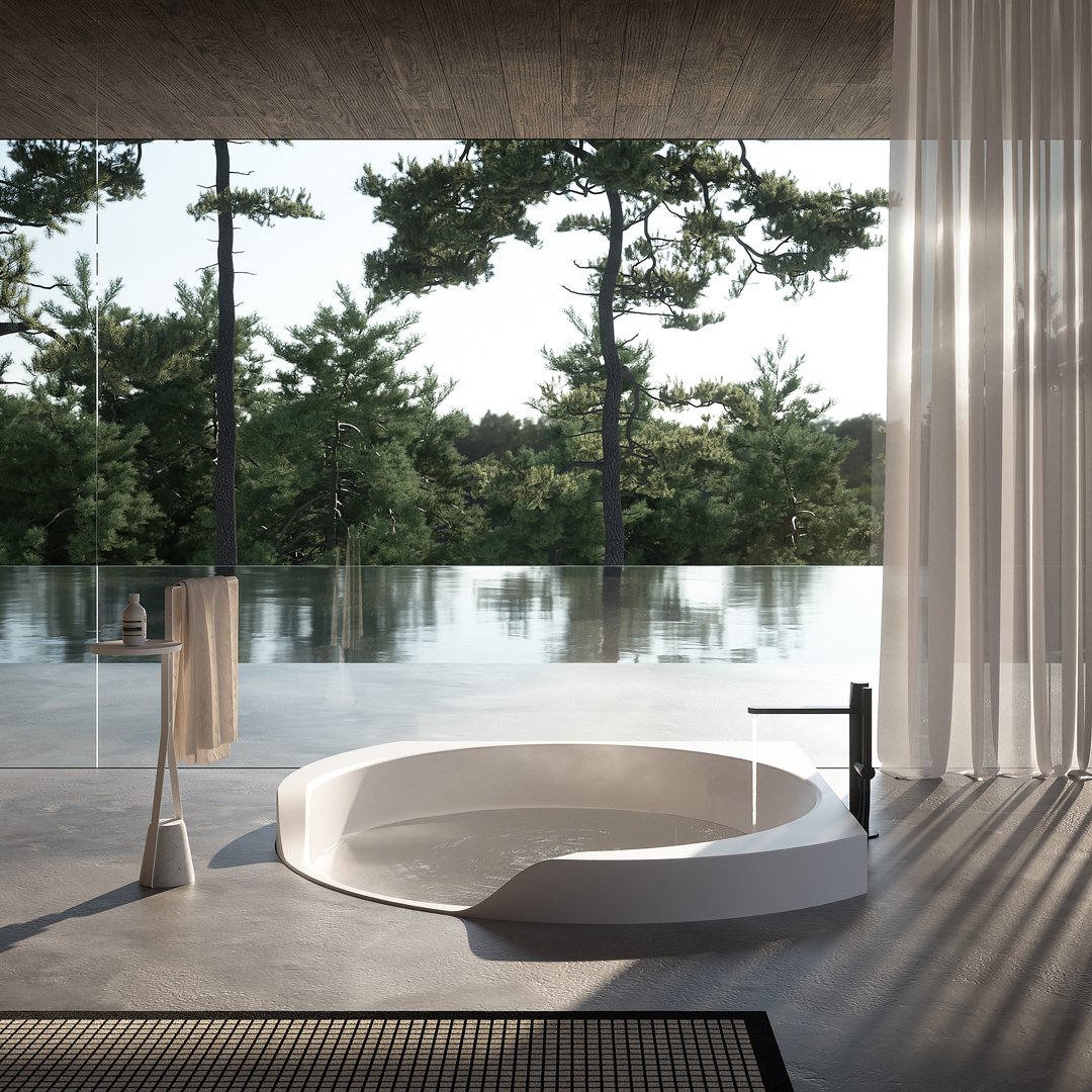 前面較低的邊緣邀請您進入,讓您完全沉浸在獨立式版本中,當它凹進地板并呈現(xiàn)一桶天然水的形象時。Ofuro 由 Flumood 制成,邊緣厚度可變,某些部分較寬,因此可以支撐物體和身體護理產品,其他部分較薄以減輕氣勢磅礴的體積。浴缸可以配備集成在底座上的 LED 燈,營造出優(yōu)雅、輕盈和懸浮的感覺。