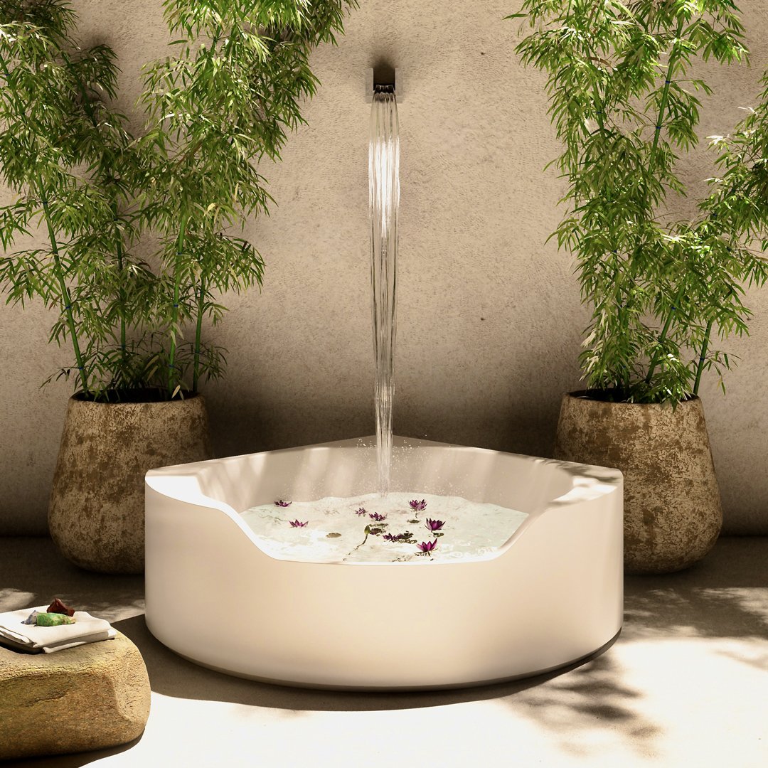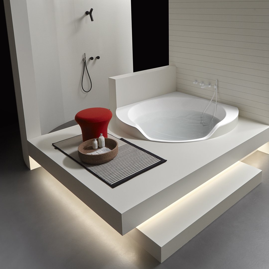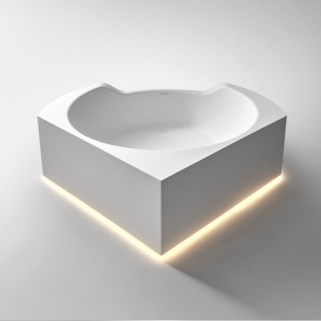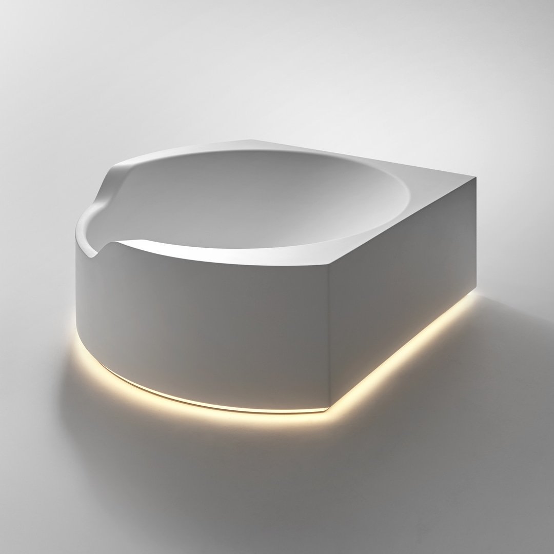 Ofuro 是一款嵌入式或獨立式浴缸,源自對 1970 年代項目的現(xiàn)代改造。一個塑料模型、一個大型雕塑、一個浴缸,它們似乎是由一塊塊制成的,經過加工、手工切割或被水的自然力侵蝕。直線和鋒利的邊緣與柔軟的形狀和曲面的共存使構圖變得有價值,也允許考慮它的角落位置。