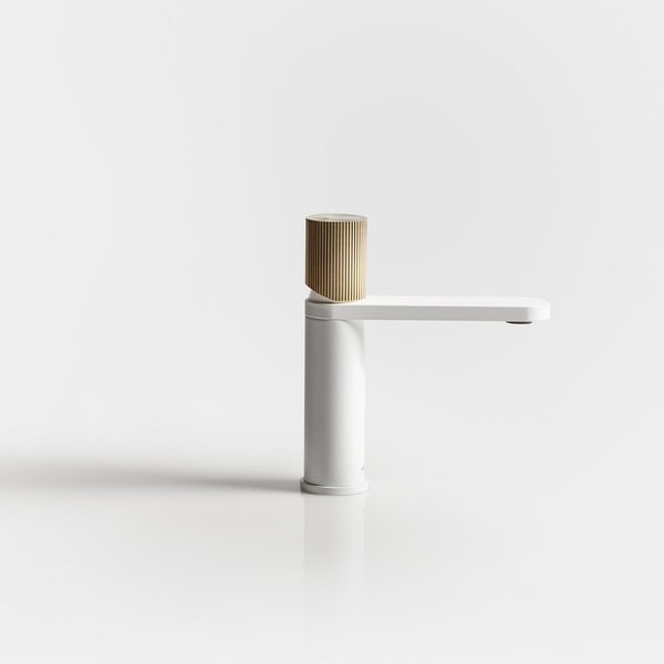刻有線性凹槽的表面、一系列平行的痕跡和符號裝飾了圓柱形體積,為水龍頭的整體形象賦予了動態外觀。雕塑般的旋鈕成為 INDIGO_Rack 中的一顆明珠,該水龍頭系列具有清晰的幾何形狀和嚴謹的線條。由區分整個 Indigo 系列的明確定義的軌跡的垂直交叉生成的組合物,它在旋鈕中找到排他性和獨特的特征,具有剖析體積的對角線切割的特征。
