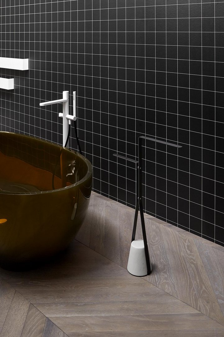 底座的材料特性,結構所描述的優雅路徑,結合在一起以實現平衡,這種平衡源于懸停在空中的愿望與反對它的重力之間的對比,將其固定在地面上。就像一個被向下拖拽的橡皮筋,但它隨后會遇到阻力和一致性,進而成為支撐。Halo 是一系列獨立的配件和桌子,重新定義了浴室內日常使用的功能元素的形象,但也可以用于房子的其他房間。