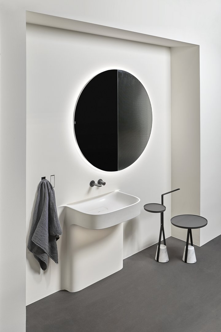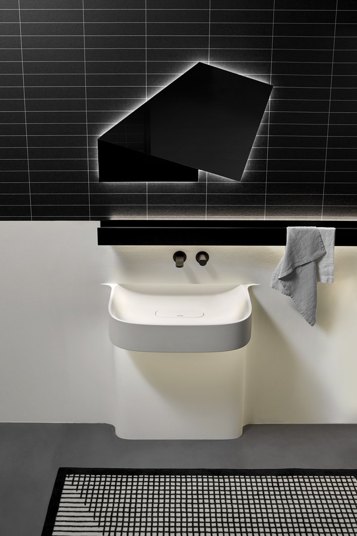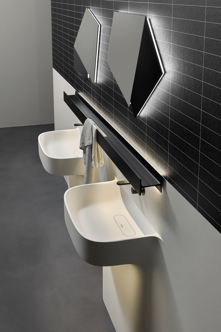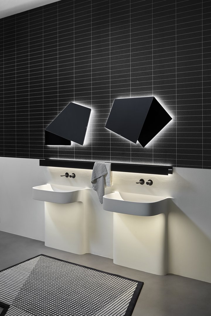 Fluido 的整體形象由柱子的寬度決定,柱子反映了盆地的尺寸,與盆地融為一體。水槽完全由 Flumood 制成,由于集成的燈光,表現出其雕塑般的形狀。用于注意體積、高度和深度尺寸的基本工具。細節上,除了水槽上方的“經典”燈飾外,Fluido還額外增加了一盞從水槽下方射出的迎賓燈,為整體增添魅力。