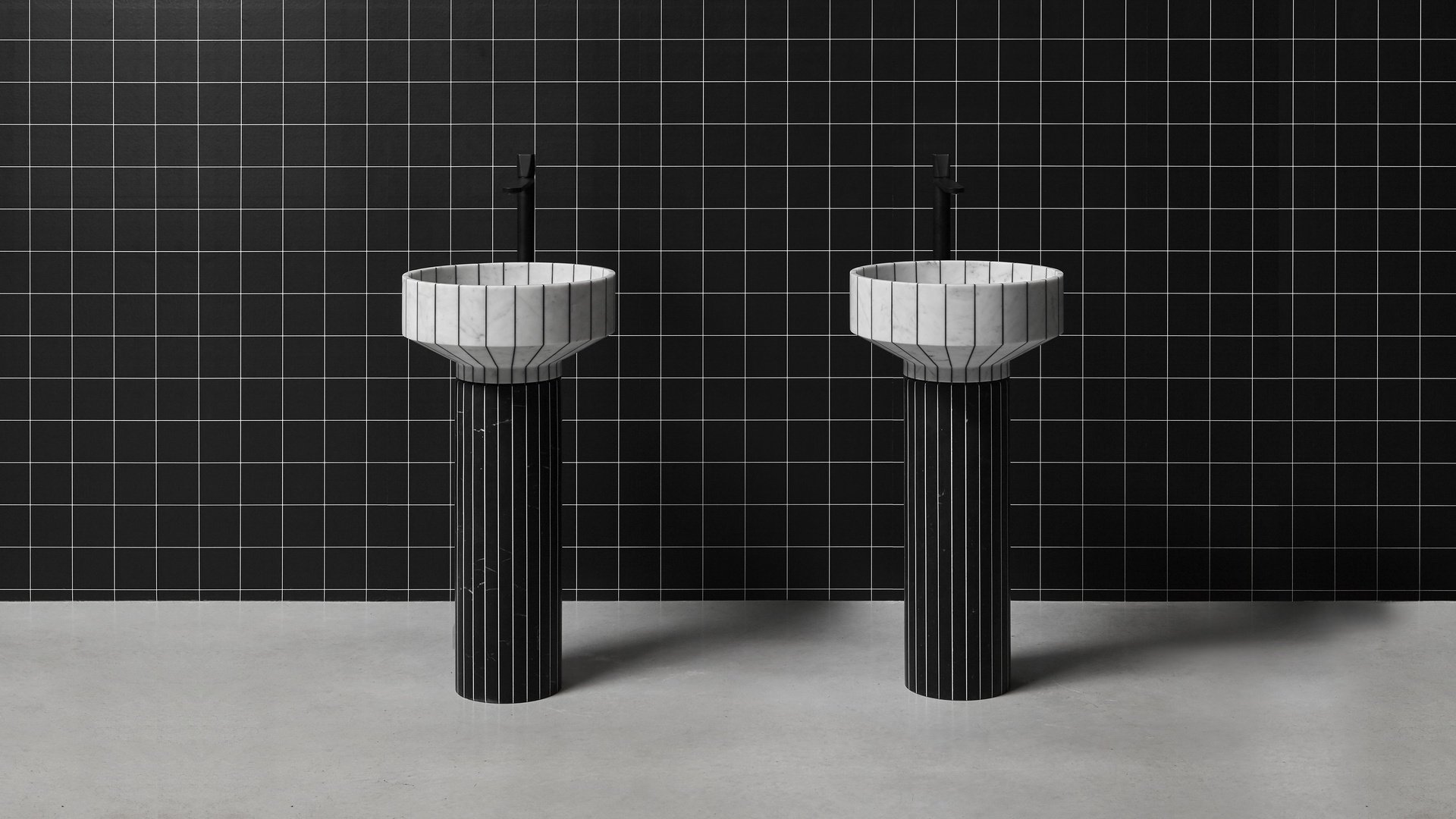 水槽的盆是用卡拉拉大理石和黑色樹脂制成的,相比之下,柱子是用黑色樹脂和白色樹脂制成的。這會產生一種色彩平衡,在不影響整體和諧的情況下改變體積的感知,減輕和“拉長”它們。