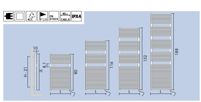 The concept for the Trim Bath model in the electric version is a variant on the H_20 model, from which only the shape of the element differs. The Trim Bath towel rail radiator consists of rectangular elements measuring 15 mm across and 20 mm high, which is the exact opposite to the H_20 model. Both bathroom towel rail radiators feature a modern distinguishing feature: they have a rectangular element instead of the more classic round shape.