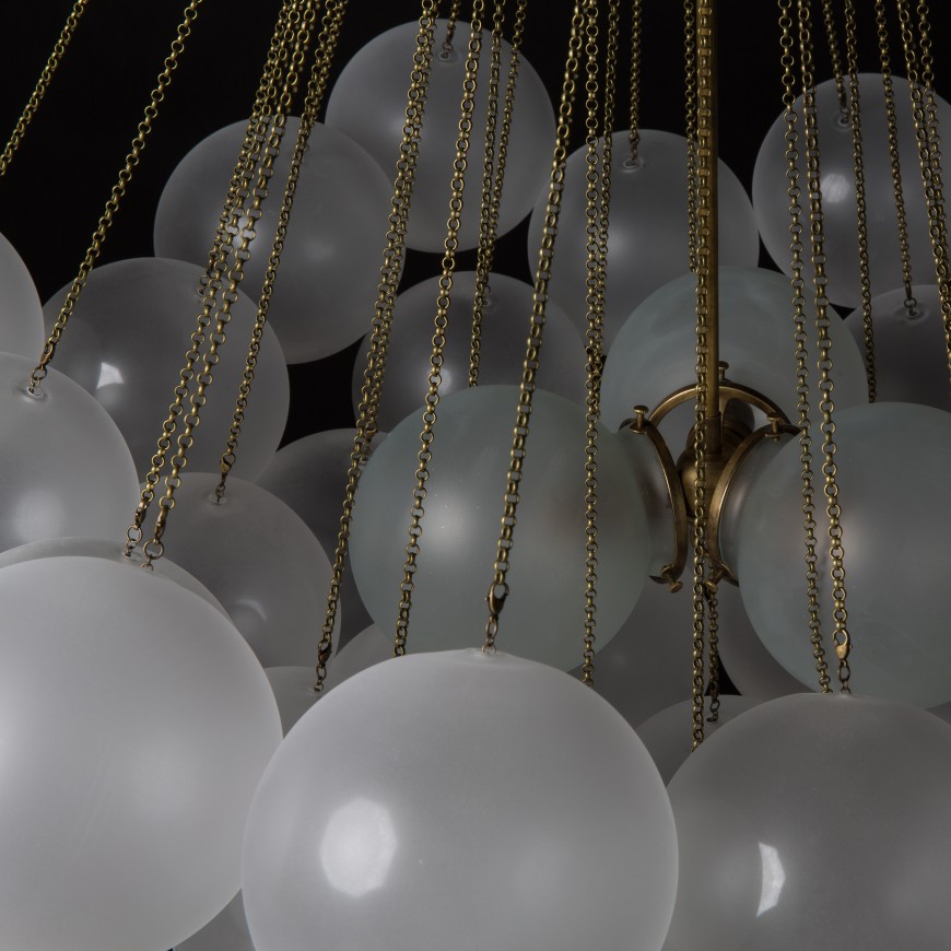 GLASS ORBS ARE FROSTED BY HAND TO CREATE AN IRREGULAR TEXTURE REMINISCENT OF 19TH CENTURY GLASS FROSTING TECHNIQUES. THREE CENTRAL LIGHT SOURCES EMIT A SOFT GLOW THAT IS REFRACTED THROUGH THE SURROUNDING CLUSTER OF ORBS.