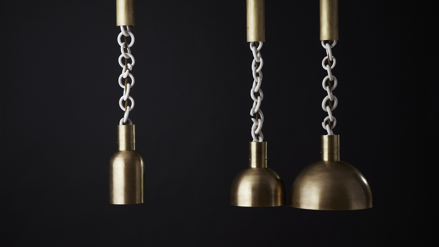 CREATED IN COLLABORATION WITH CERAMICIST ALICE GOLDSMITH, THE LINK PORCELAIN PENDANT EXAMINES BOTH THE STRENGTH AND VULNERABILITY OF THE ARTIST'S PORCELAIN CHAIN. FRACTURED LINKS SUSPEND OVERSIZED BRASS SHADES, THEIR FRAGILITY ANCHORED AND PROTECTED BY THE OPPOSITIONAL METAL.