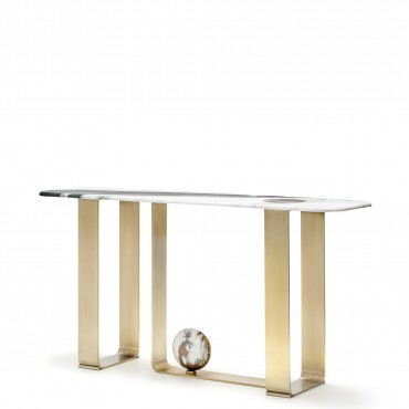 Designed by nature and perfected by expert master craftsmen, our Minerva console table will make a superb addition to a hallway or under a grand mirror. Featuring an elegant top in satin Dalmata marble with an unprecedented marquetry in glossy horn, this console table is a lush interplay of complex textures and subtle natural veins. Sat atop a sleek structure in satin metal, embellished by a decorative horn sphere, Minerva will imbue a contemporary home with sophisticated elegance.