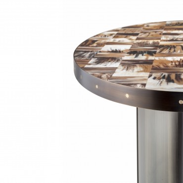 Luxury materials and impeccable craftsmanship converse together in our Nettuno console table. An intertwined motif of matte horn tiles, meticulously paired by expert artisans, characterizes its top and offers unmistakable style and excellence. Supported by a sturdy structure in burnished brass plated stainless steel, the design is added a modern touch by a beautiful edging accented with contrasting screws in 24k gold plated brass. With its half-moon silhouette, this console table works particularly effectively placed against walls and it’s sure to provide a fabulous focus in your entryway.