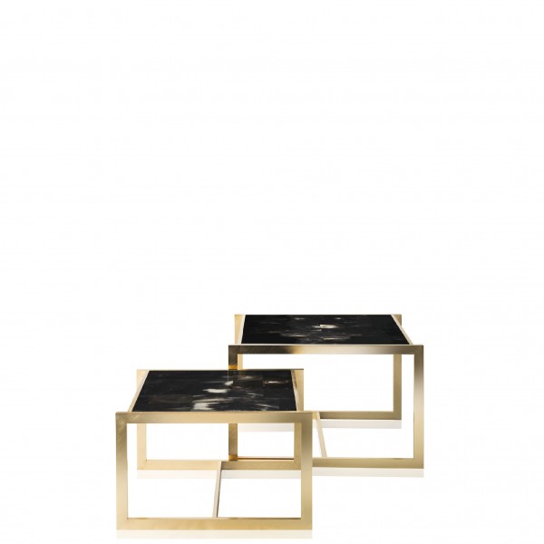 Nesting tables in dark horn and hand engraved 24K gold plated brass.