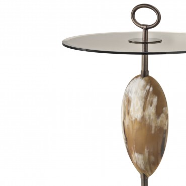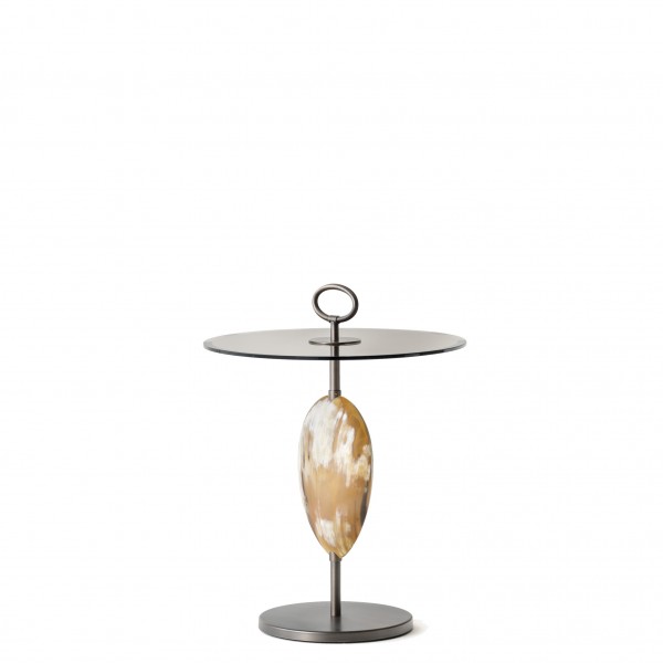 Excellent craftsmanship meets exclusive style and research in our Macari Side Table. Featuring a contemporary structure in burnished brass, this design is set apart by a captivating oval-shaped horn piece with matte finish. A circular top in bronze glass, accented with a decorative handle in burnished brass is the ideal surface to place photo frames, flowers or the like.