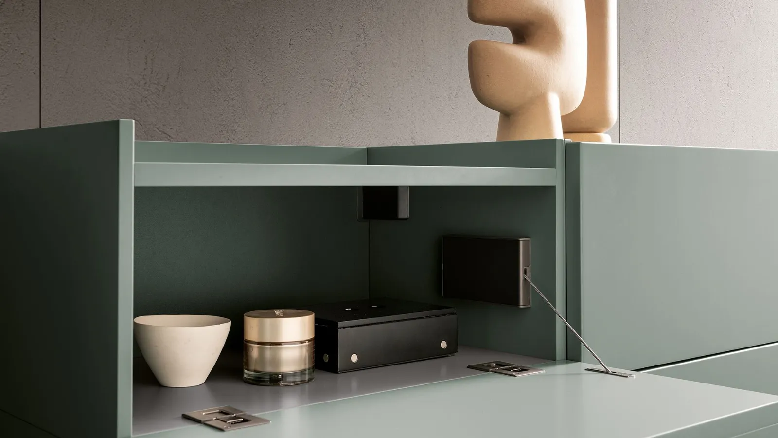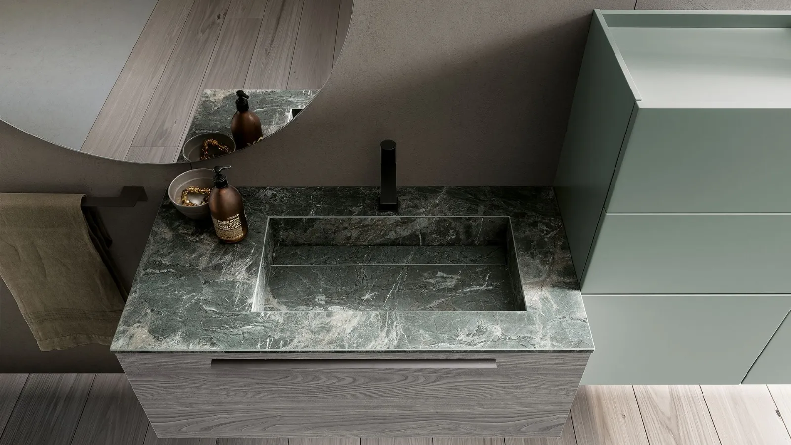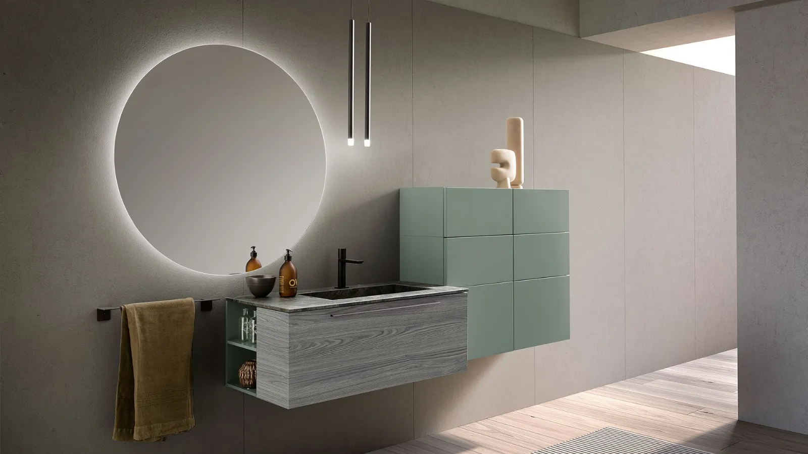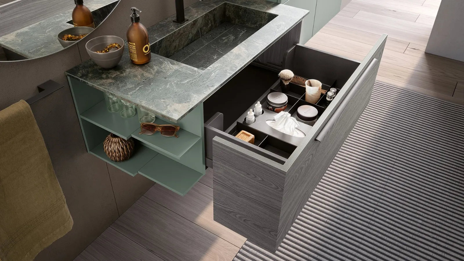 BASE PORTA LAVABO CON FRONTALE A "L" IN MEZZAFIAMMA GRIGIO CON MAN. M22 TITANIO E VANO LATERALE A GIORNO LACCATO GIADA OPACO COME LA COMPOSIZONE DI PENSILI AFFIANCATA - TOP IN GRES AMAZONICO SLATE CON VASCA GZZ5 - SPECCHIO RAGGIO CON LAMPADE TUBE NERE.