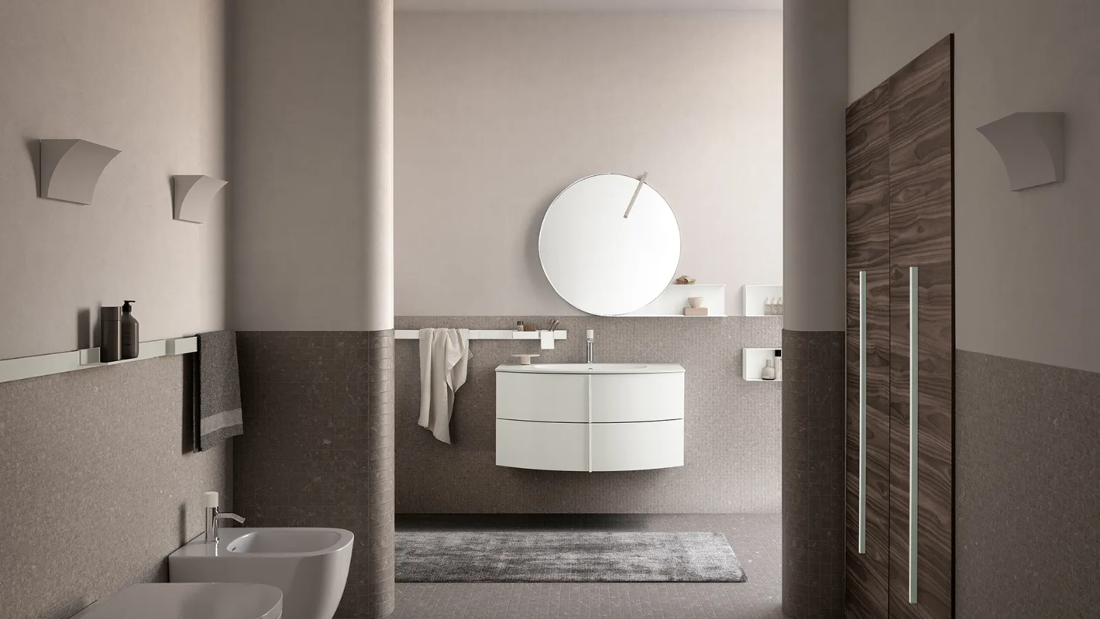 LACCATO BIANCO OPACO CON MANIGLIA M31 IN LEGNO BIANCO. - TOP OCRITECH BIANCO OPACO CON VASCA OEE5. - SPECCHIO VIRGOLA ED ELEMENTI A GIORNO IN METALLO BIANCO. - LAMPADA ATLA. - COLONNA COMPOSTA PORTAELETTRODOMESTICI CON VANO PORTA-SCOPE IN FINITURA MINATO.