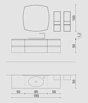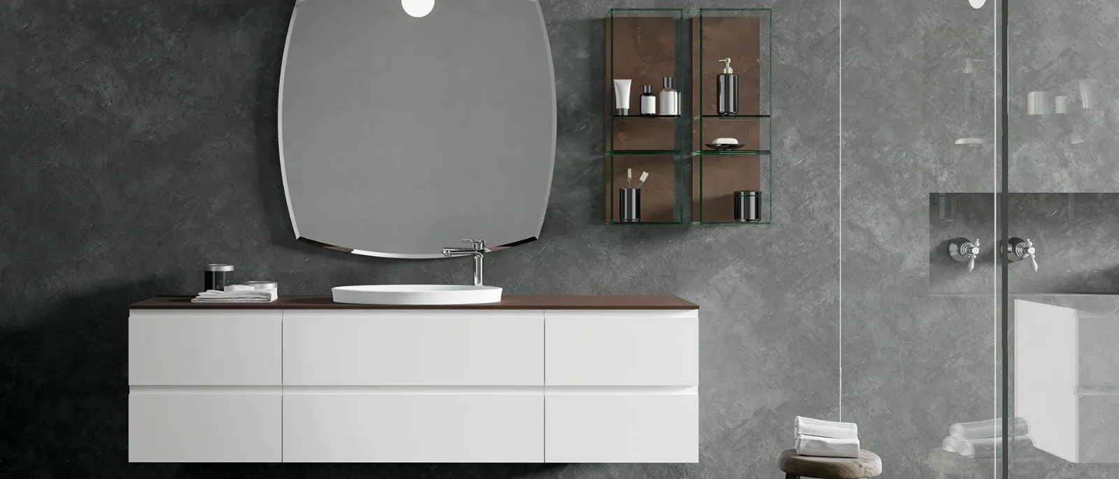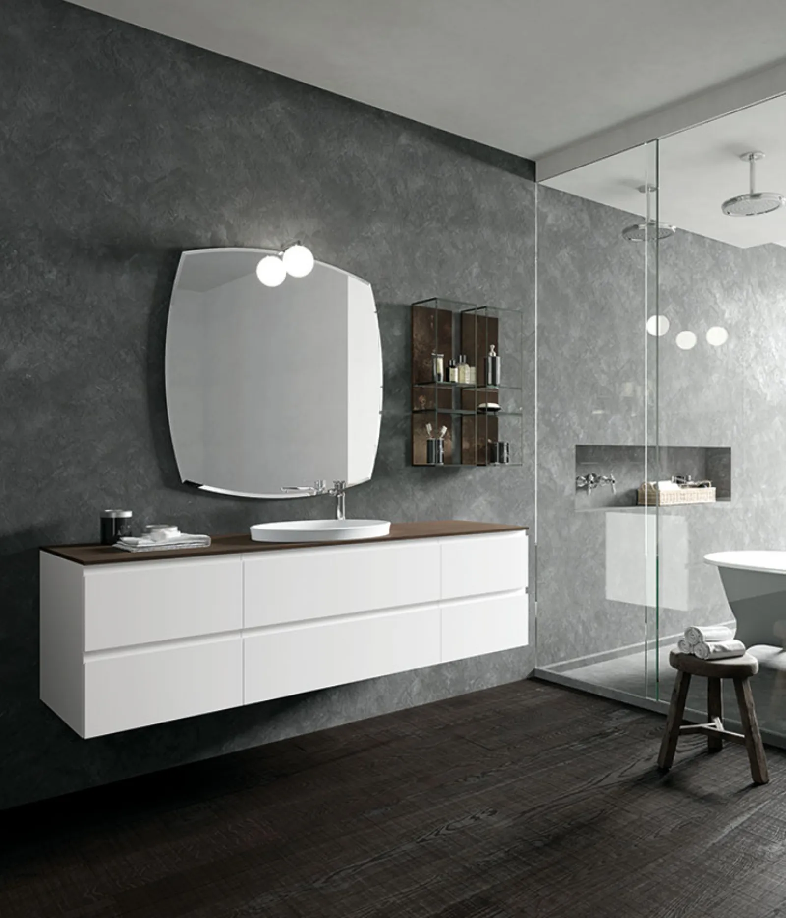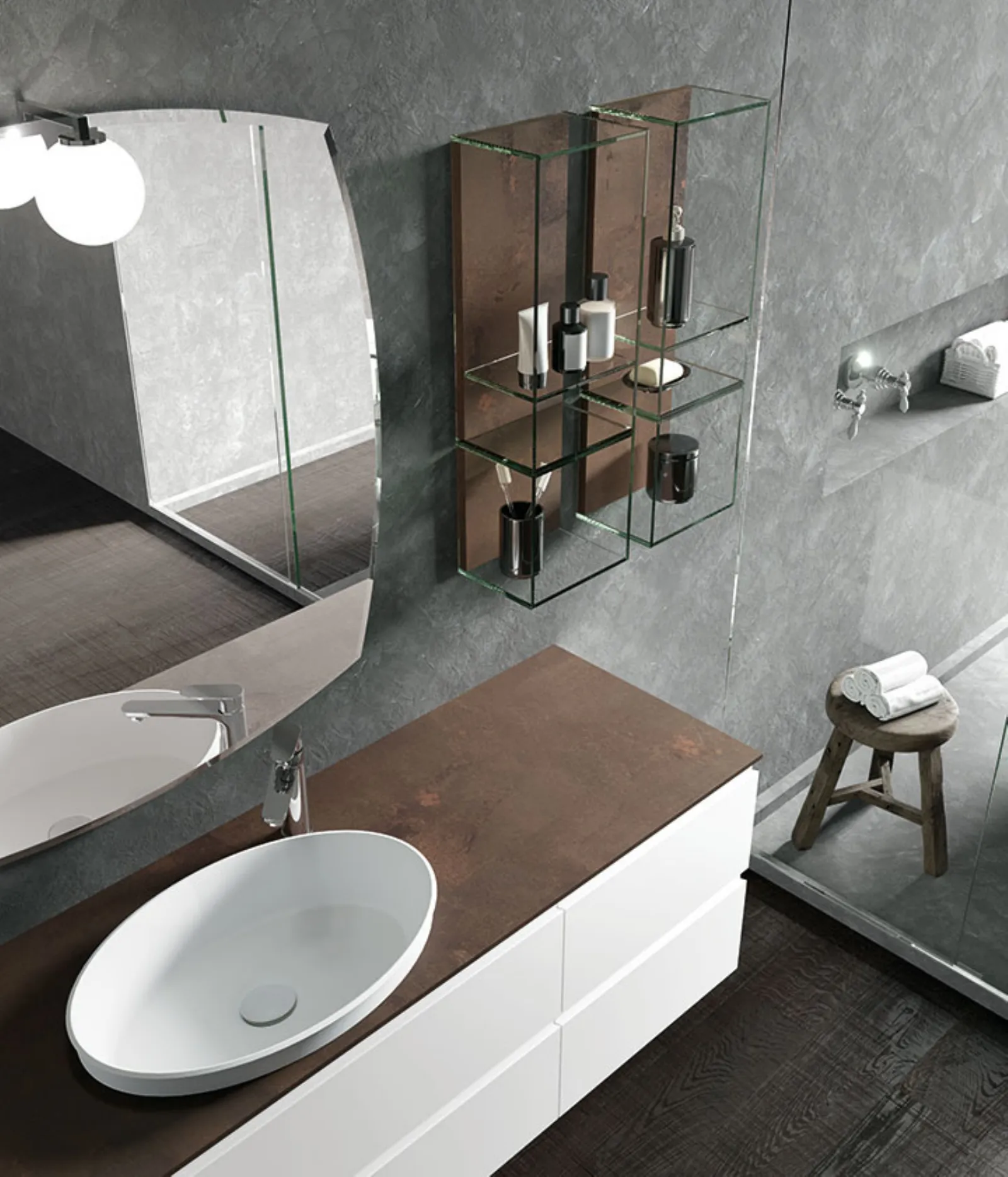 Laccato Bianco Opaco, schiena elementi a giorno in vetro e top in hpl Ossido 146, lavabo Skin Down, specchio Vintage.